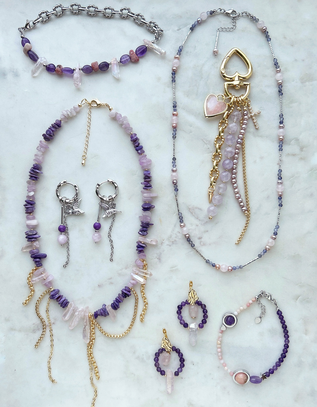 Когда говорят о фиолетовых камнях, то, конечно, большинство сразу вспомнит про аметист. В нашей подборке "7 идей для украшений" мы решили показать, какие еще камни можно использовать, если вы любите этот цвет или заказчики хотят "что-нибудь новенькое": фосфосидерит, чароит, кордиерит. Дополнили украшения сиренево-розовыми камнями, такими как опал, кунцит, розовый кварц, лавандовый аметист, тонированные кристаллы кварца. И, как всегда, привели подробный список артикулов со ссылками на нужные бусины и фурнитуру и наши комментарии по сборке на тот случай, если вы захотите повторить какое-то изделие!