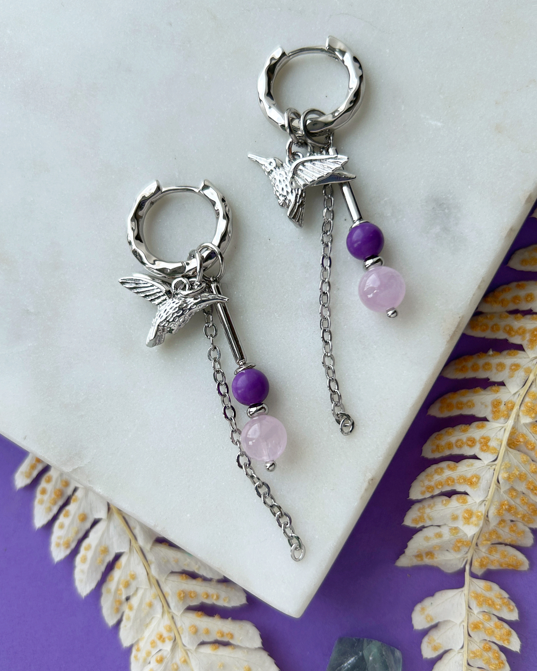 Серьги-трансформеры с колибри, кунцитом и фосфосидеритом