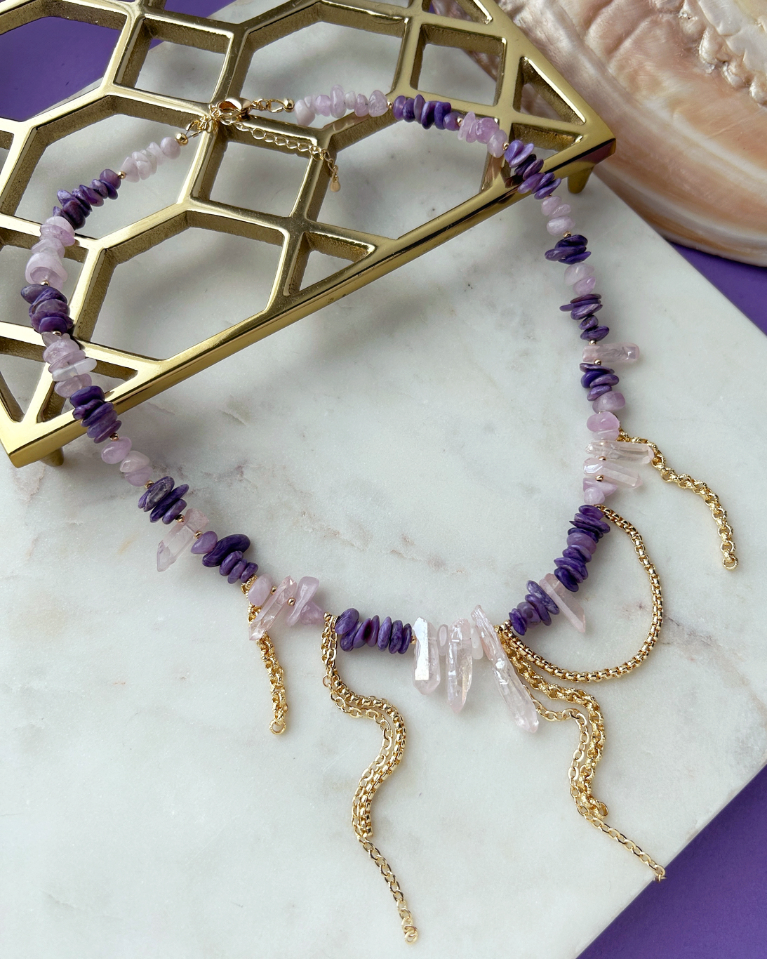 Колье мы дополнили крошкой: и кристаллы, и крошка - это достаточно свободные формы, которые хорошо сочетаются между собой. Мы взяли кунцит и чароит. Кстати, использование крошки - хороший вариант, если клиент хочет какой-то дорогой камень, но при этом бюджет на изделие ограничен.