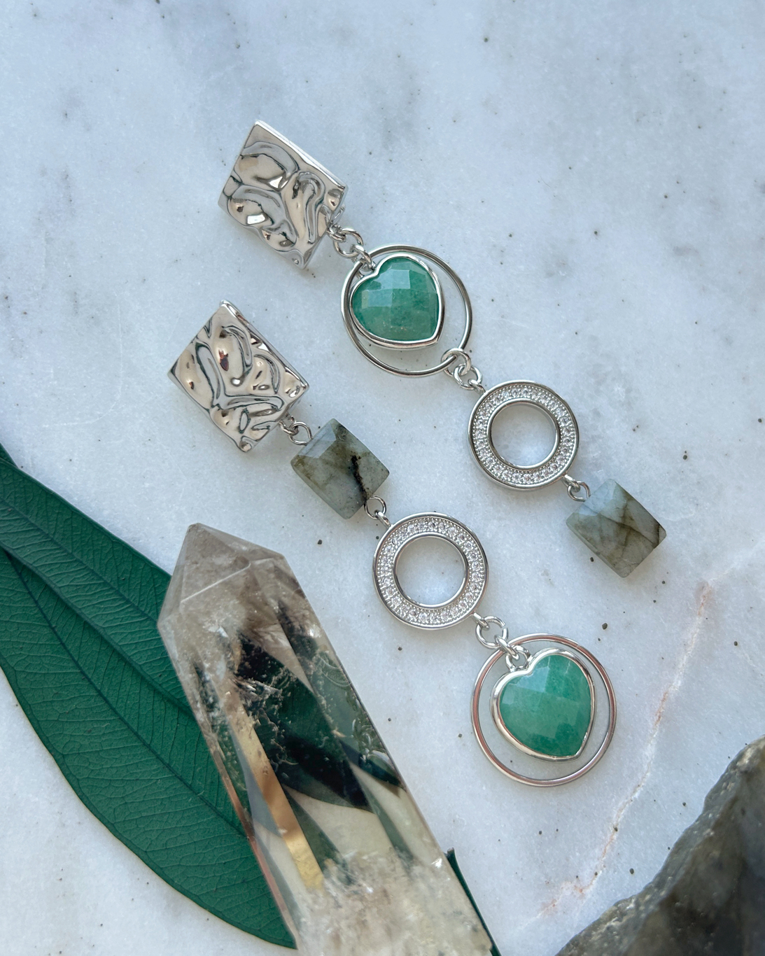 В этих сережках мы сочетаем сразу несколько форм: квадратные швензы, прямоугольники из лабрадора, два размера кругов и сердечки из авантюрина. Здесь все просто: делаем петельки на пинах для установки бусин из лабрадора, далее собираем все в нужном порядке с помощью колечек. Один нюанс: обратите внимание на расположение колечек. Иногда требуется поставить два колечка вместо одного, чтобы элементы смотрели в нужную сторону.