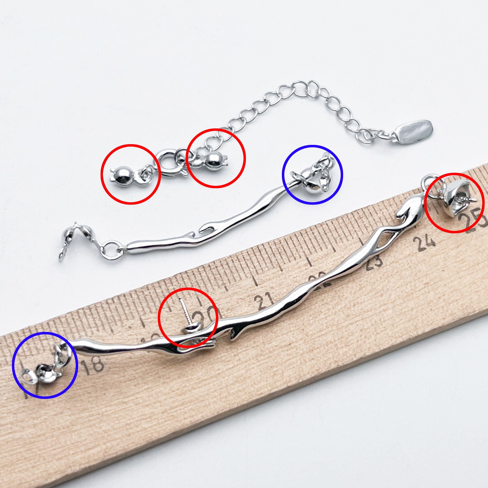 Комплект из коннекторов с замком идет в сборе с каллотами и бейлами под вклейку. Красными кружками мы обозначили то, что сняли полностью (два закрытых каллота, чтобы не ставить в изделие элемент, который уже сгибался и разгибался, а также бейлы под вклейку), а синим обвели элементы, которые сняли и переставили в другое место на этом же колье (два открытых каллота). У замочка разъемные колечки: мы рекомендуем отогнуть их и загнуть обратно только один раз на финальной сборке. Если разгибать их несколько раз туда-сюда, то колечко может обломиться, и тогда придется взять другой замок.