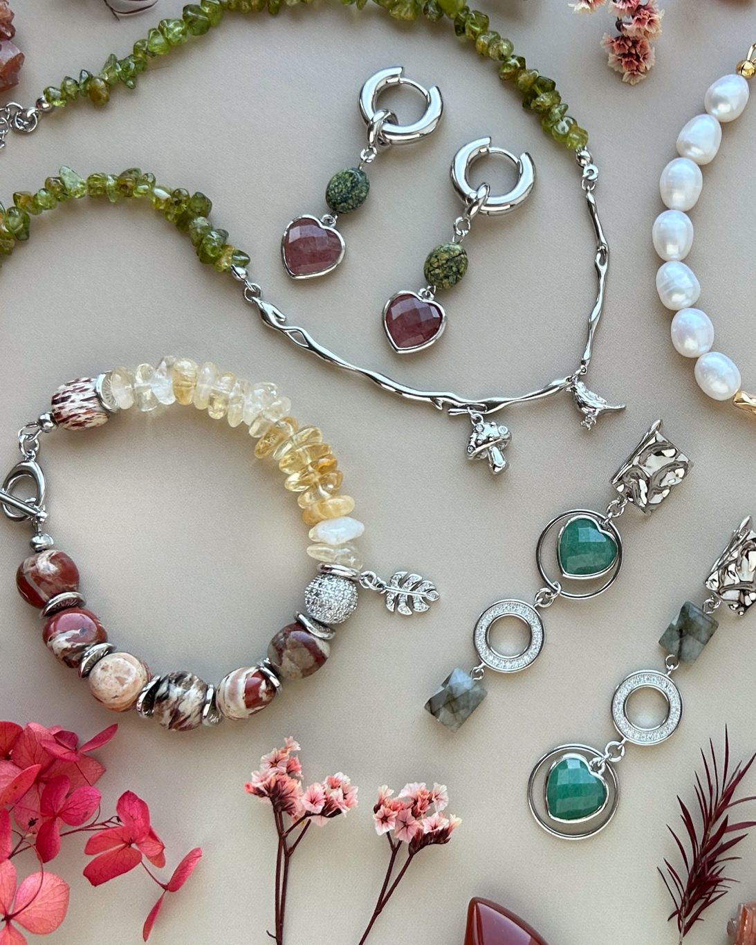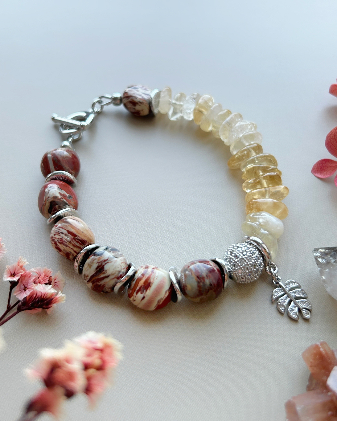 В этом браслете главное - это сочетание яшмы фриформ и крупной крошки из "цитрина". Остальные элементы можно брать на свое усмотрение, например, заменить подвеску и бусину с фианитами на более лаконичные вставки, либо поменять цвет металла с серебристого на золотой. Браслет изготовлен на тросике с классической закрепкой и замком, но бусины такой формы будут также хорошо смотреться и на резинке.