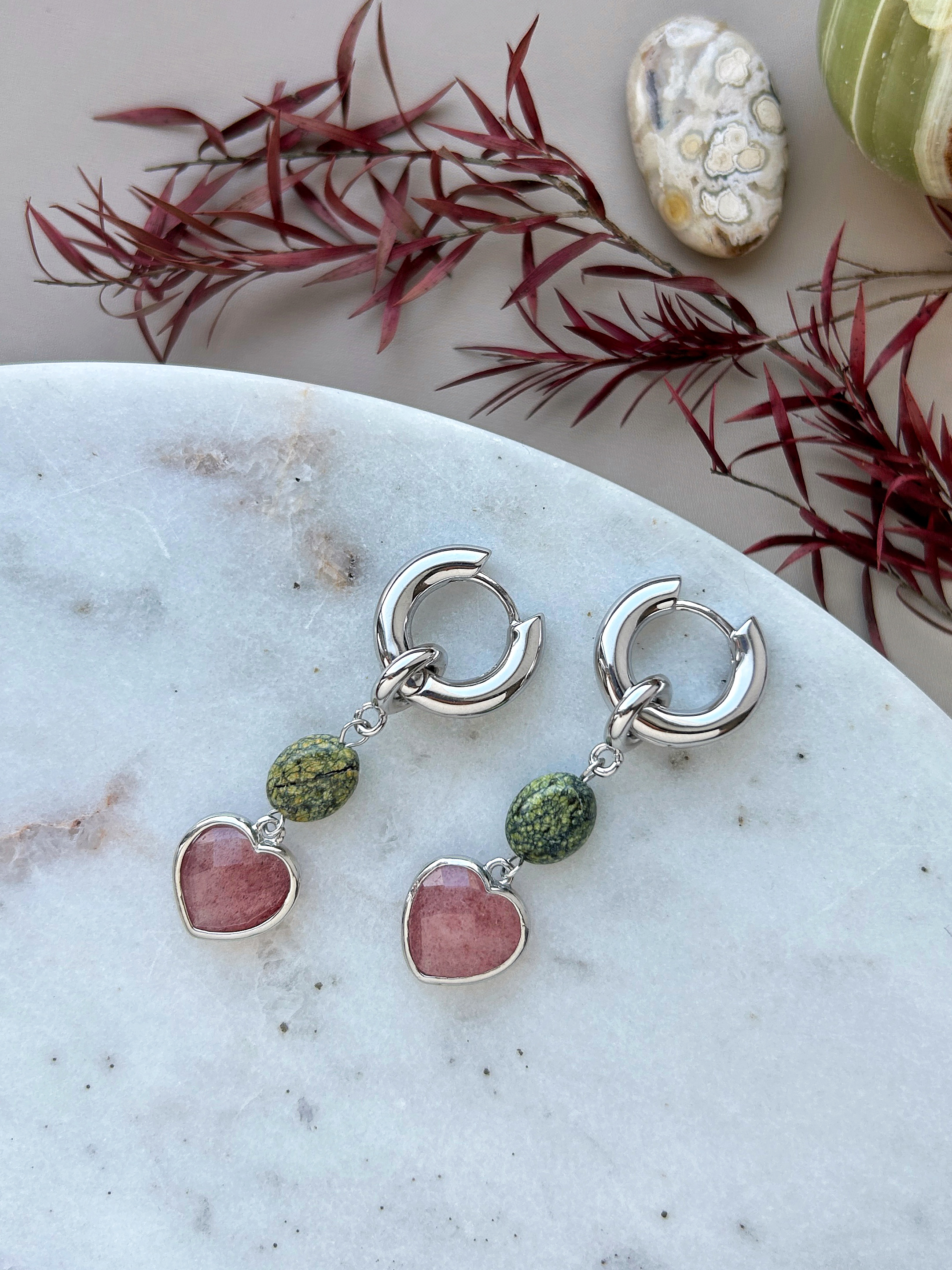 Этими сережками мы хотим напомнить, как это прекрасно - трансформеры! Благодаря конструкции швенз и подходящим бейлам можно за секунду снимать и надевать подвески. Швензы не имеют дополнительных петелек (в отличие от швенз с английским замком), так что их можно носить без подвесок, просто как серьги-колечки). Можно сделать несколько вариантов подвесок и менять их по своему настроению. А если хочется сделать более лаконичный дизайн, вы можете не устанавливать бусины змеевика в изделие, а добавить только сердечки из "клубничного" кварца.