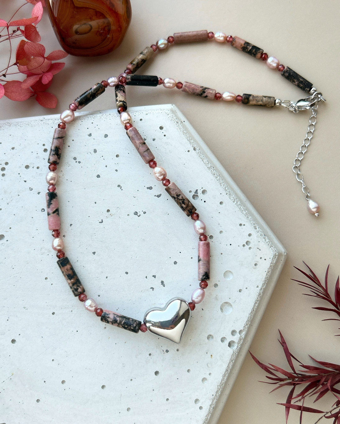 В этом украшении мы сочетаем оттенки розового и красного: розовый жемчуг, гранат, родонит. Дополнили бусиной в форме крупного сердечка. Обратите внимание, что на замочек мы также добавили небольшую деталь: сняли идущий в комплекте с карабином концевик и заменили его бусиной жемчуга на пине.