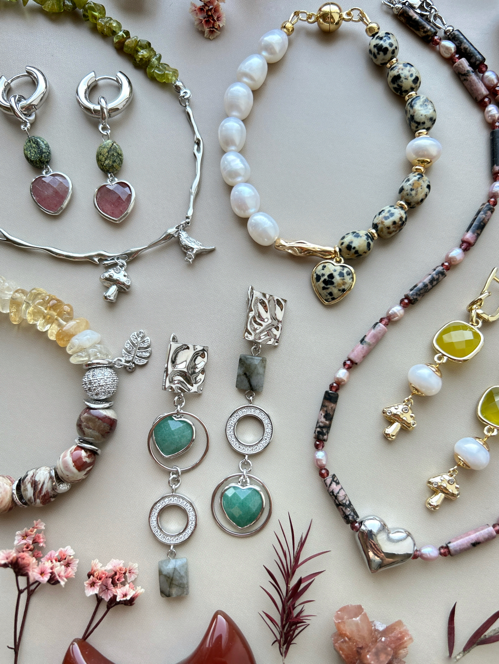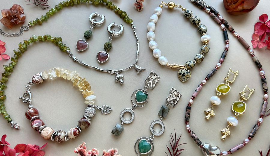 Мы подготовили три пары сережек, два браслета и два колье. По традиции разберем подробно каждое изделие, а также приведем артикулы и ссылки на всю фурнитуру и все бусины. Вы сможете собрать точно такое же изделие, либо вдохновиться нашим сочетанием и сделать что-то свое.