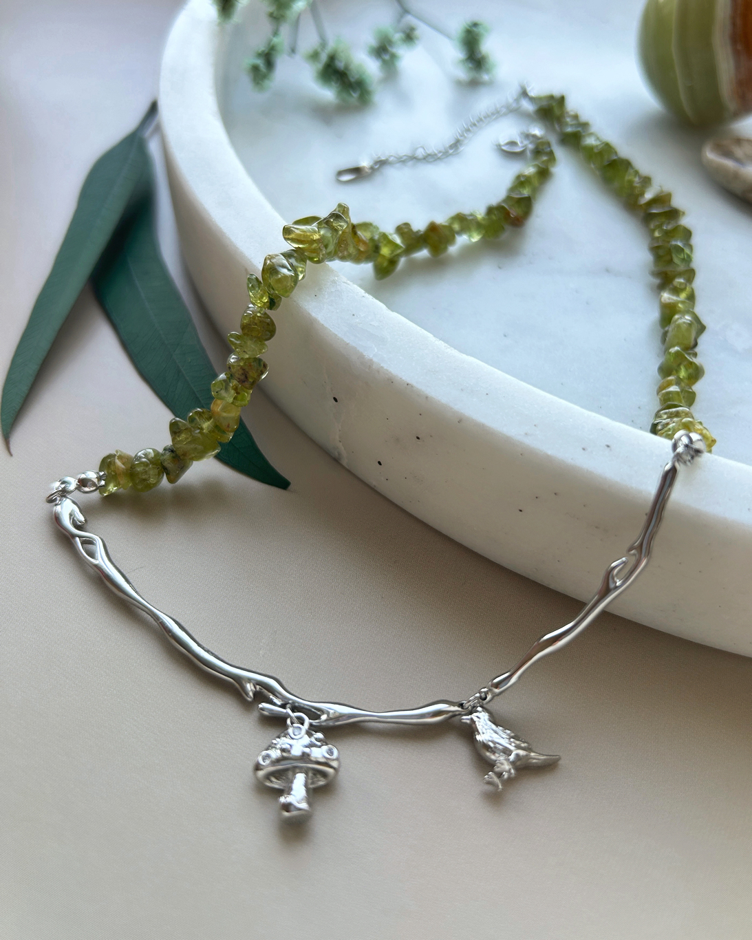 Главный герой здесь - это, конечно, коннектор. И не просто коннектор, а целый набор из двух коннекторов в форме веточек и замочка. Решили показать, как он будет смотреться в готовом изделии. Дополнили колье крошкой хризолита, птичкой и грибочком.