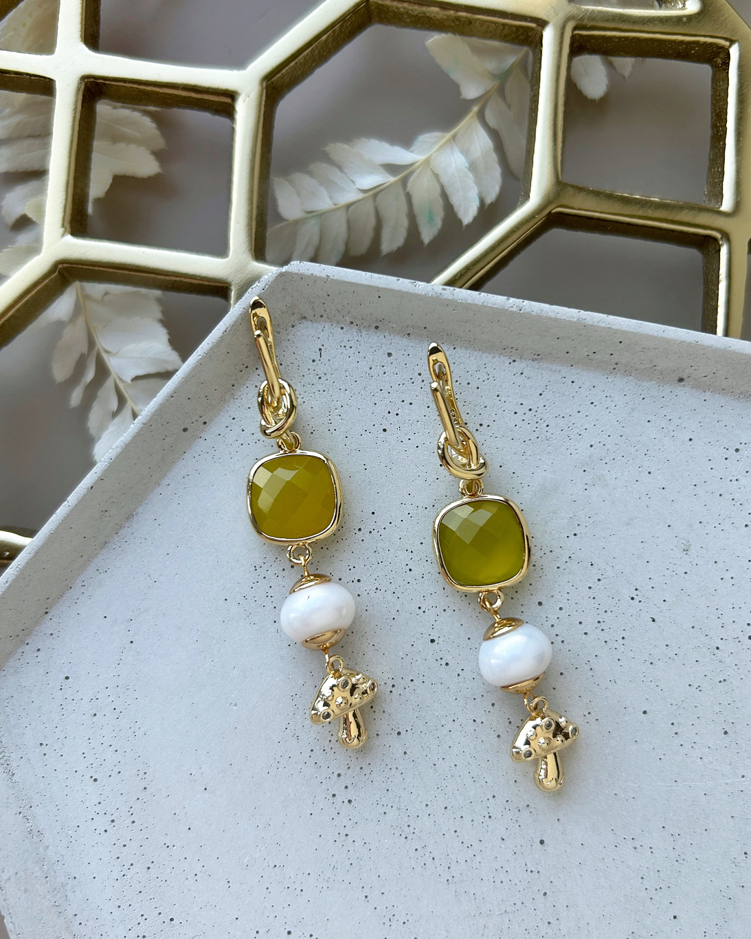 Уж очень нам нравятся подвески-грибочки, которые мы использовали в серебряном цвете в предыдущем изделии. Поэтому решили взять их также в золотом цвете и сделать серьги. Дополнили их коннектором с серпентином и жемчугом.