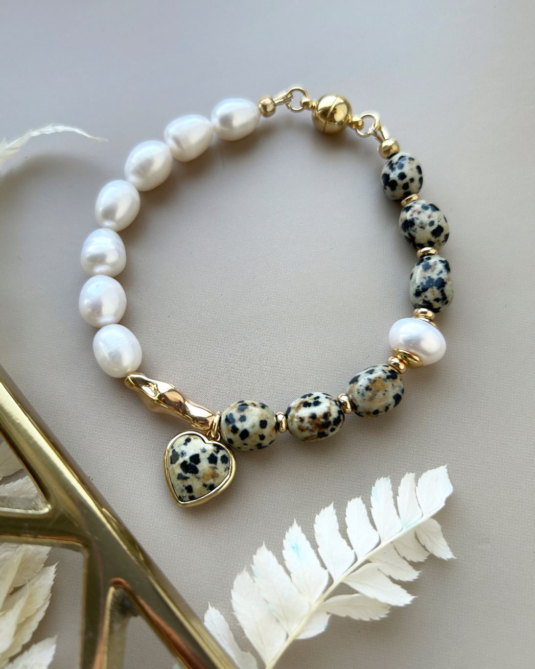 Мы ни разу не показывали магнитный замок в готовых изделиях, поэтому решили это исправить! У него есть большое преимущество: его очень удобно застегивать, когда надеваешь изделие сам себе. В качестве основного камня мы выбрали "далматин" (если быть точнее, то эта порода состоит из полевого шпата, кварца и амфибола; ее также называют порфир), дополнили крупным жемчугом и фурнитурой золотого цвета. Закрепка делается так же, как и в случае с обычным карабином.