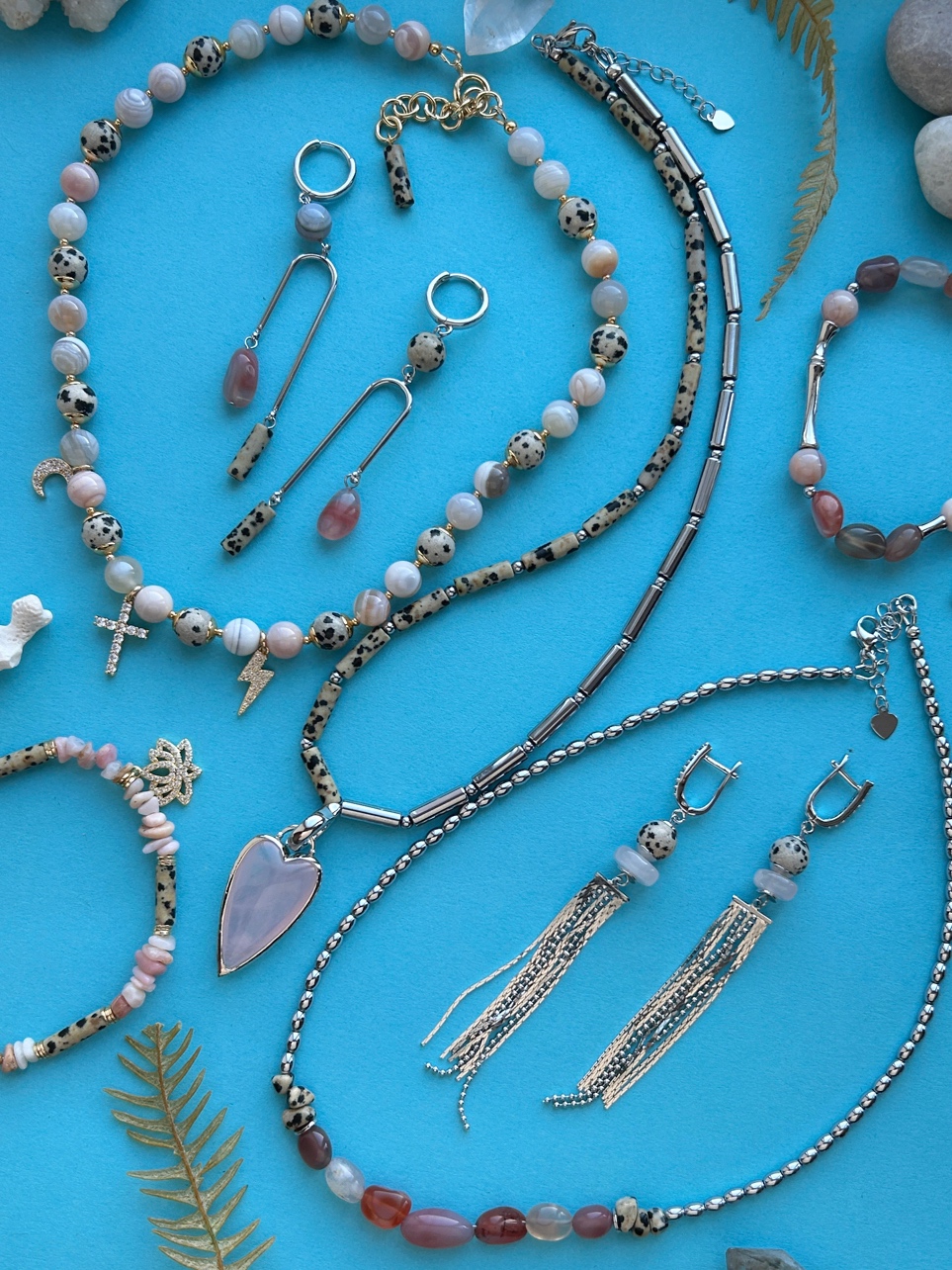 Украшения мы дополнили оттенками розового: опалом, агатом, кварцем. У нас получилось три шейных украшения, два браслета и две пары сережек. Как всегда приводим подробный список материалов с артикулами и ссылками, а также наши комментарии по сборке. Вы можете полностью повторить нашу идею или взять за основу сочетание материалов и придумать свое украшение!