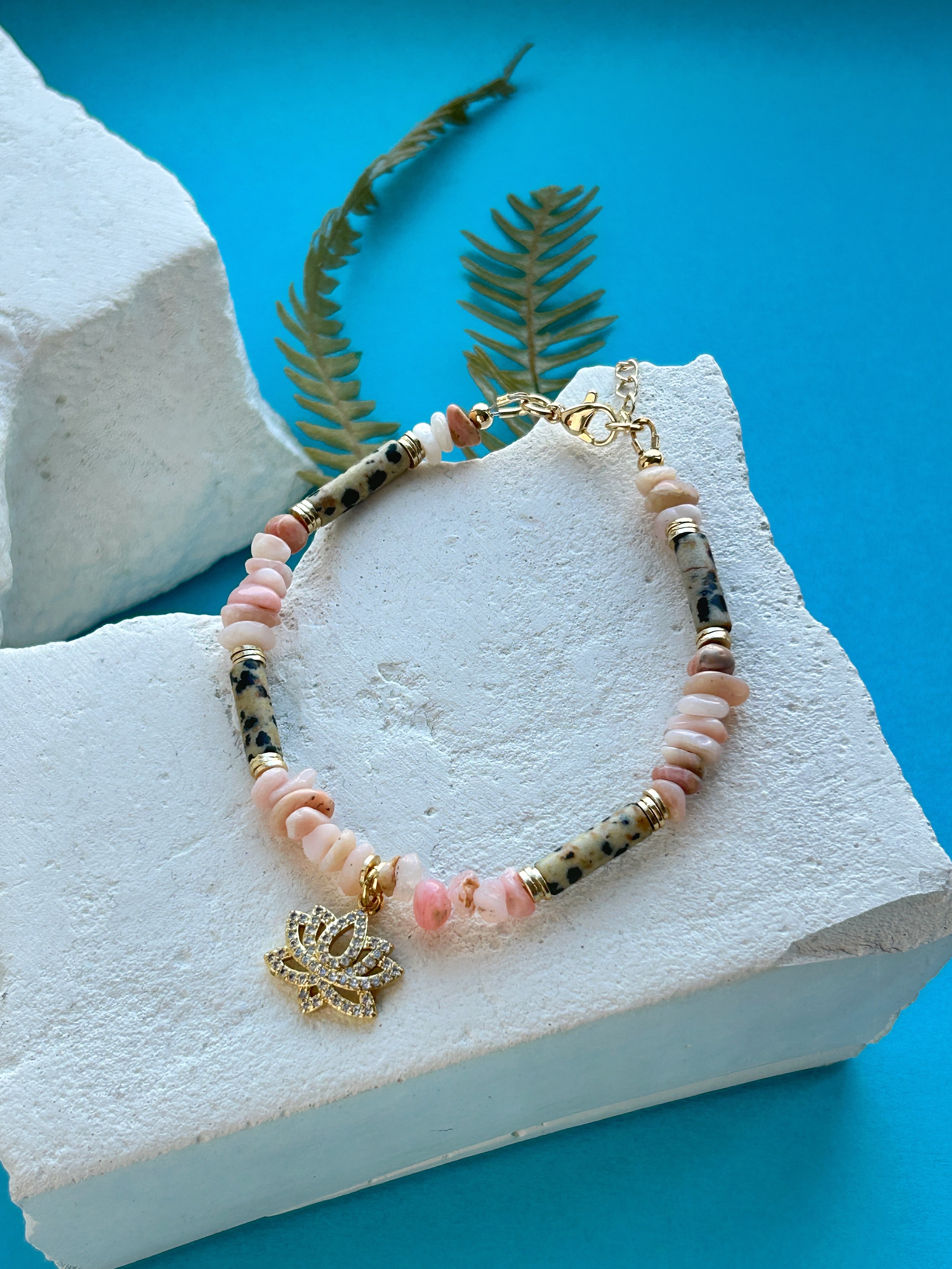 Браслет с крошкой из розового опала и лотосом