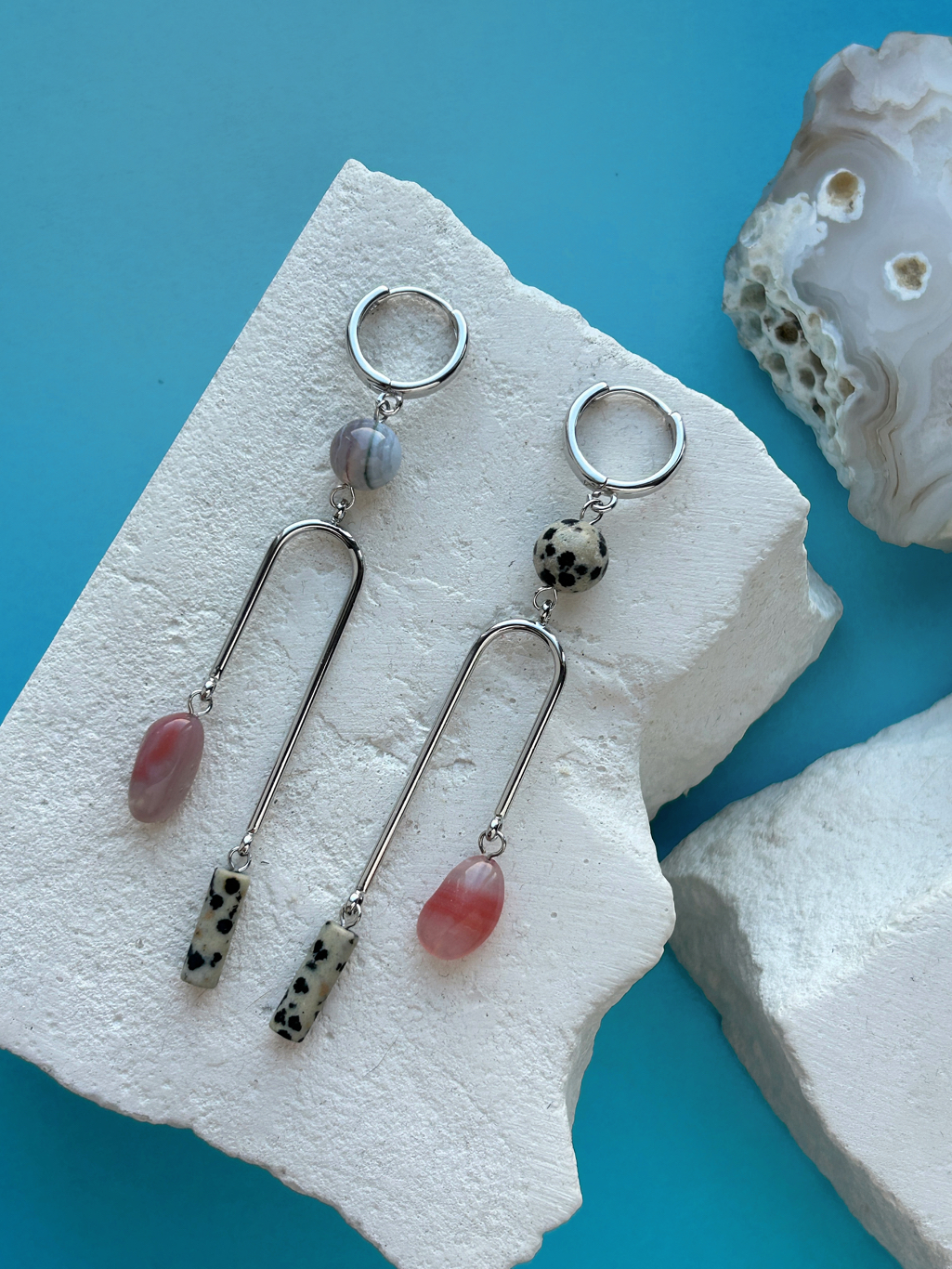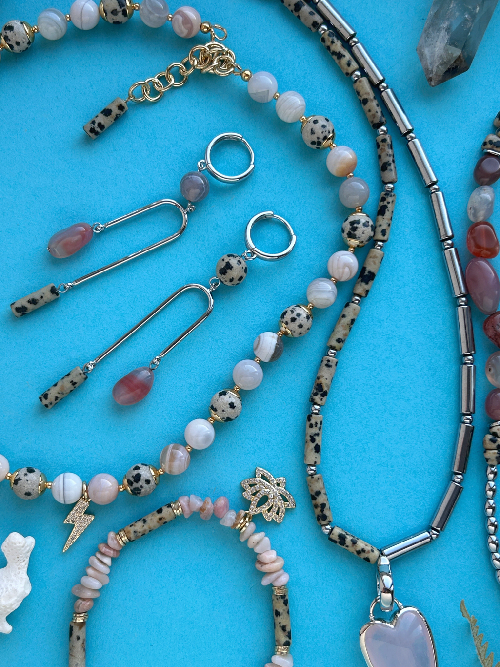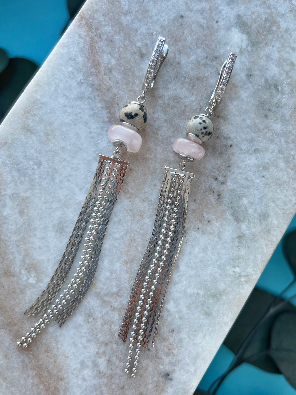 Сегодня в нашей постоянной рубрике "7 идей для украшений" покажем очень красивое и популярное сочетание - "далматин" и камни в розовой цветовой гамме. Несмотря на свой необычный рисунок, "далматин" очень хорошо сочетается со многими камнями, поэтому мы не раз использовали его в наших подборках.