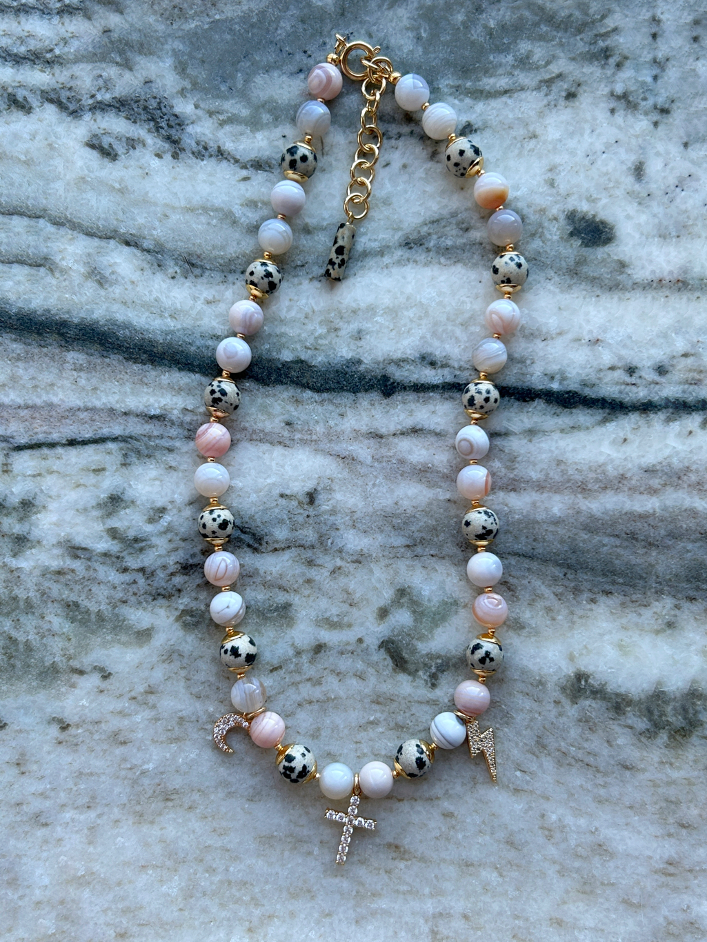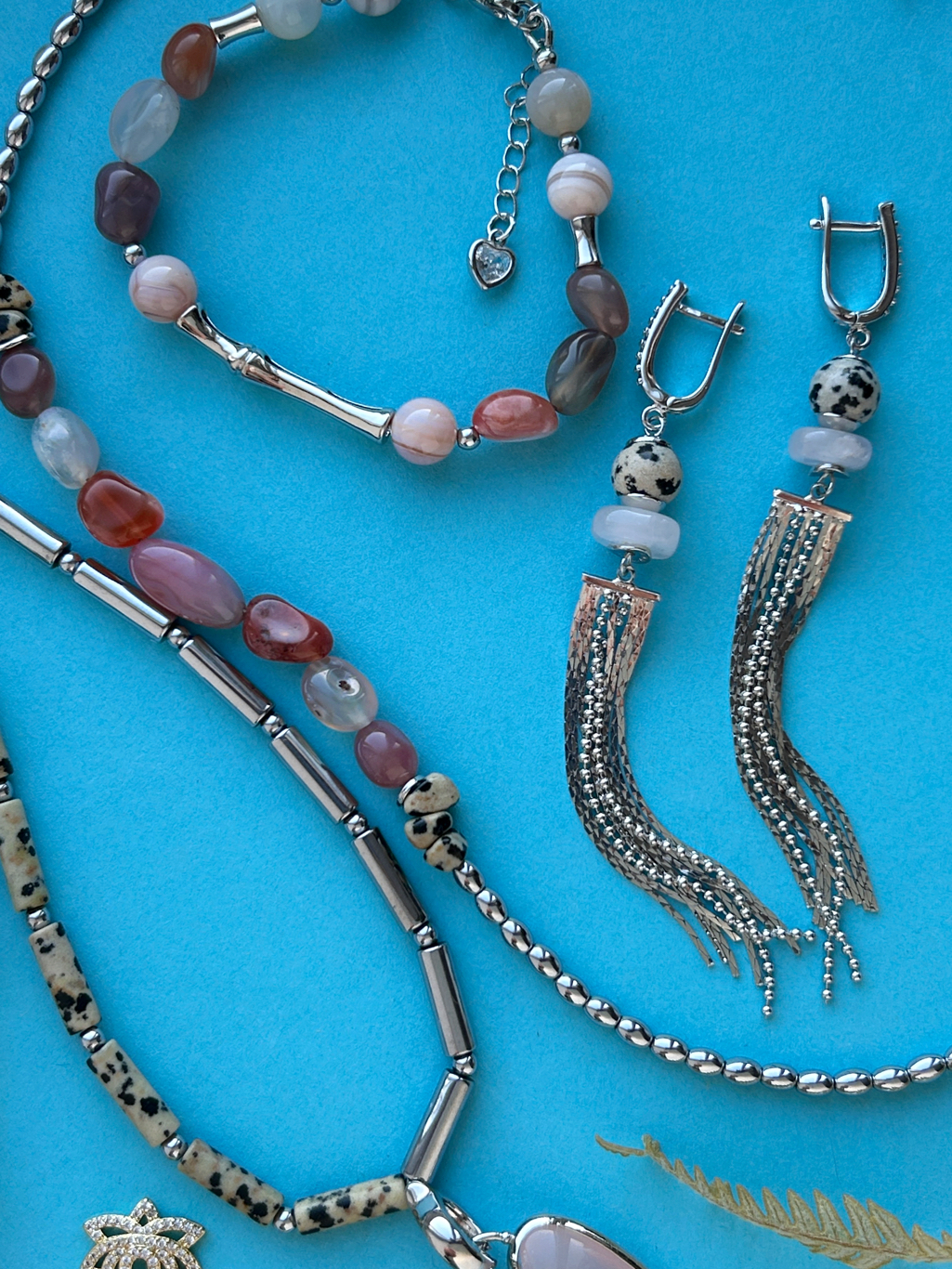 - 4 вида бусин: "далматин" 8 мм ДАЛ-016, "далматин" в форме трубочек ДАЛ-005, розовый агат 8 мм АГТ-064, галтовка из агата ГАЛТ-076;