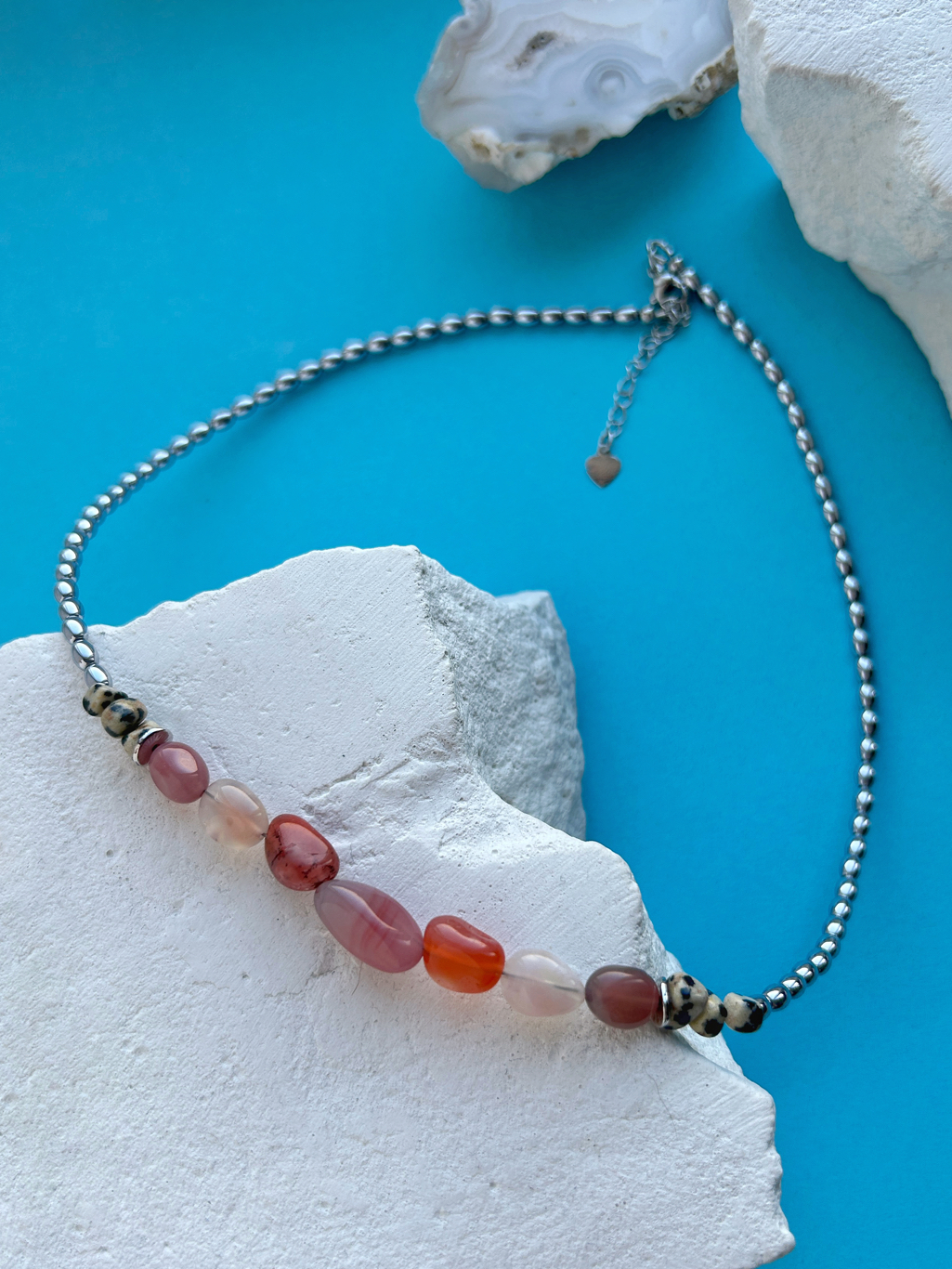 Колье с розовым агатом и подвесками