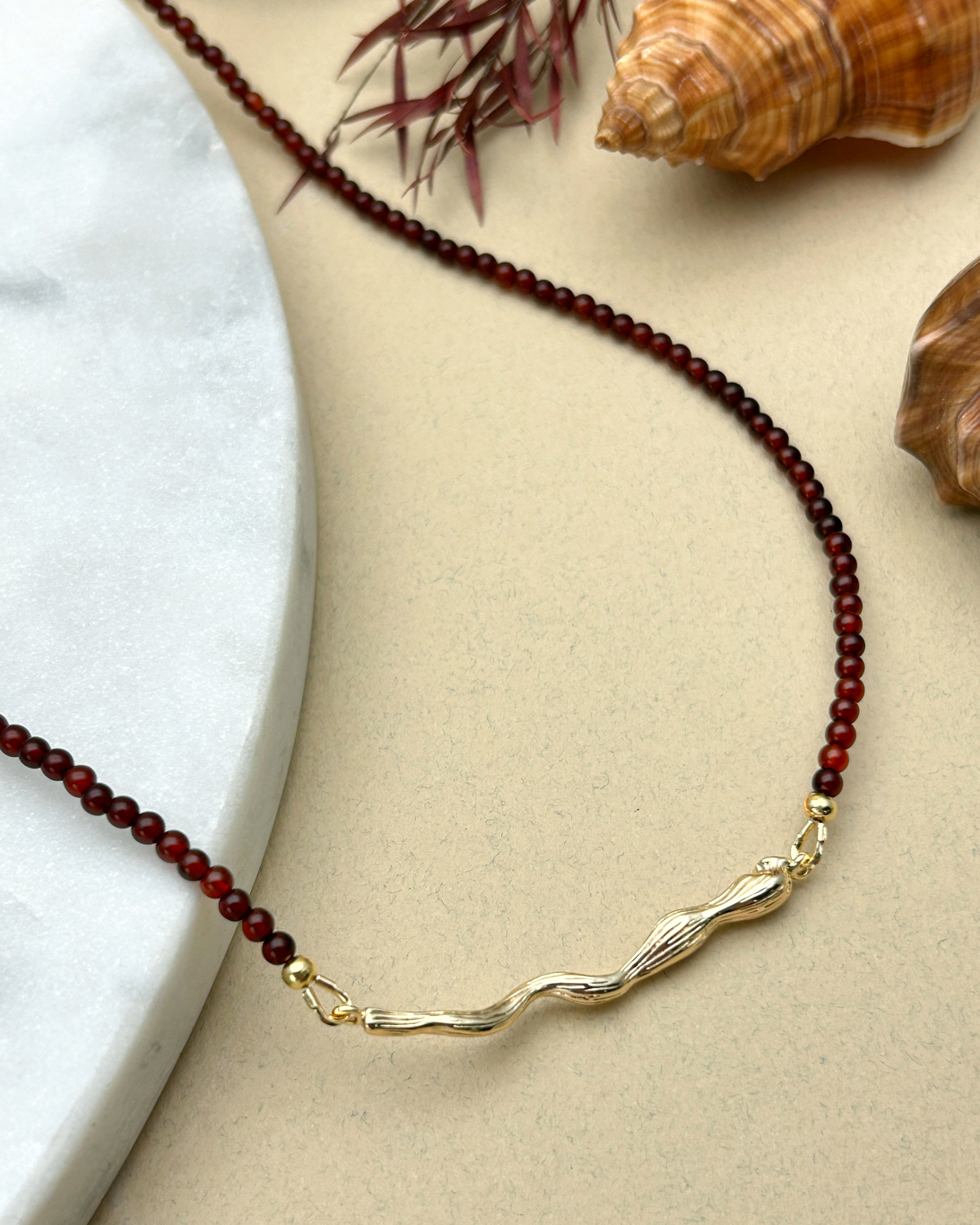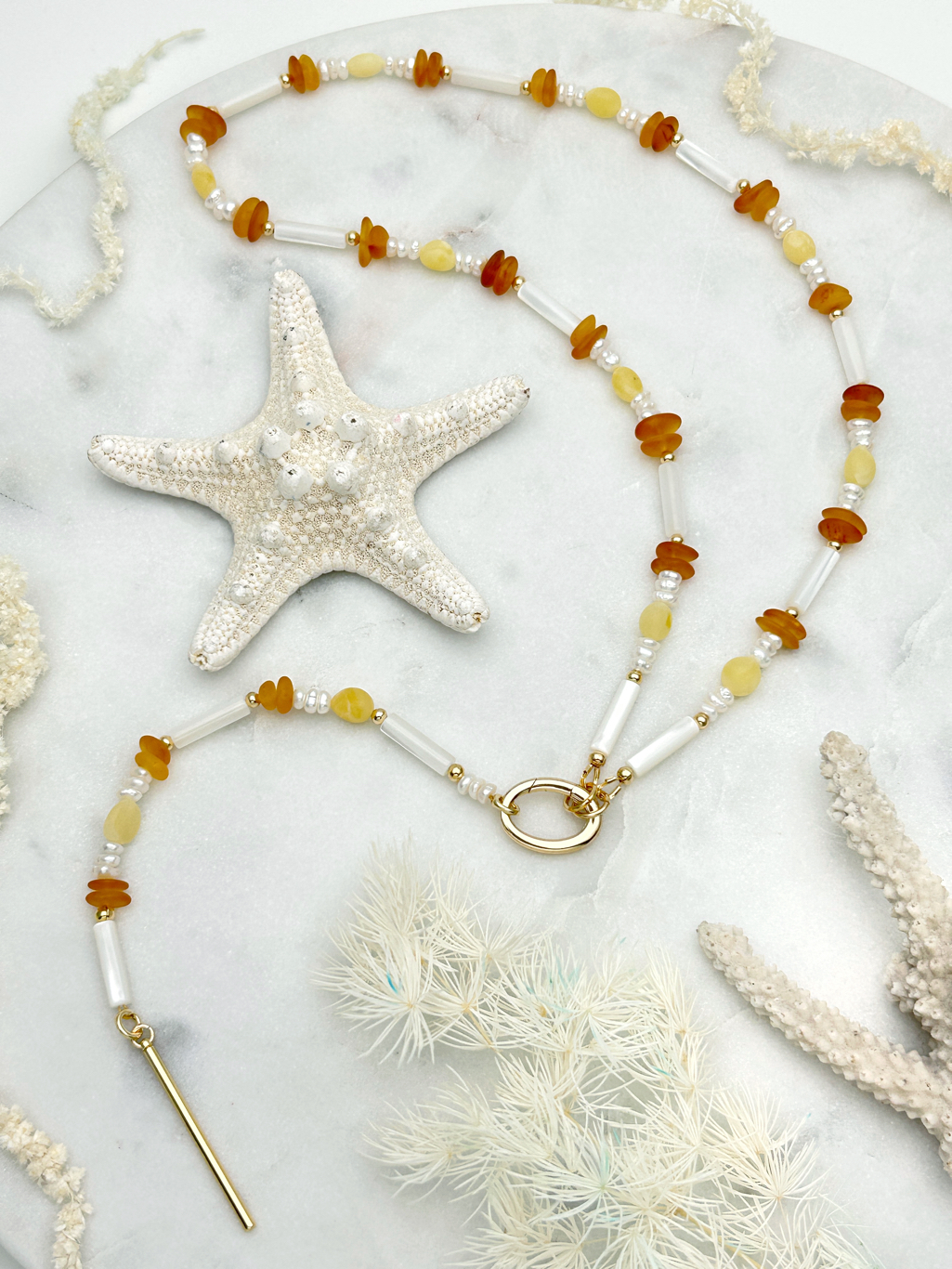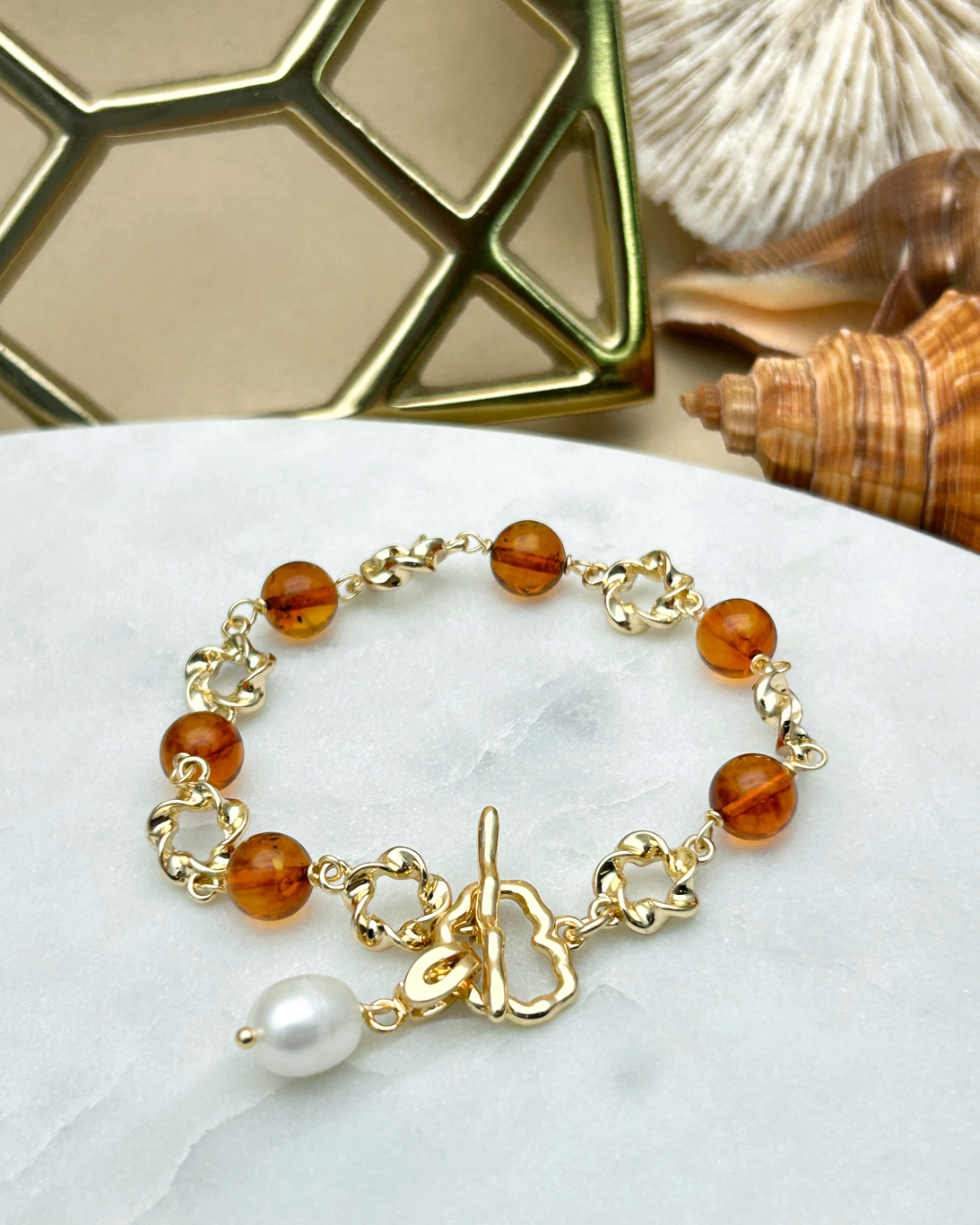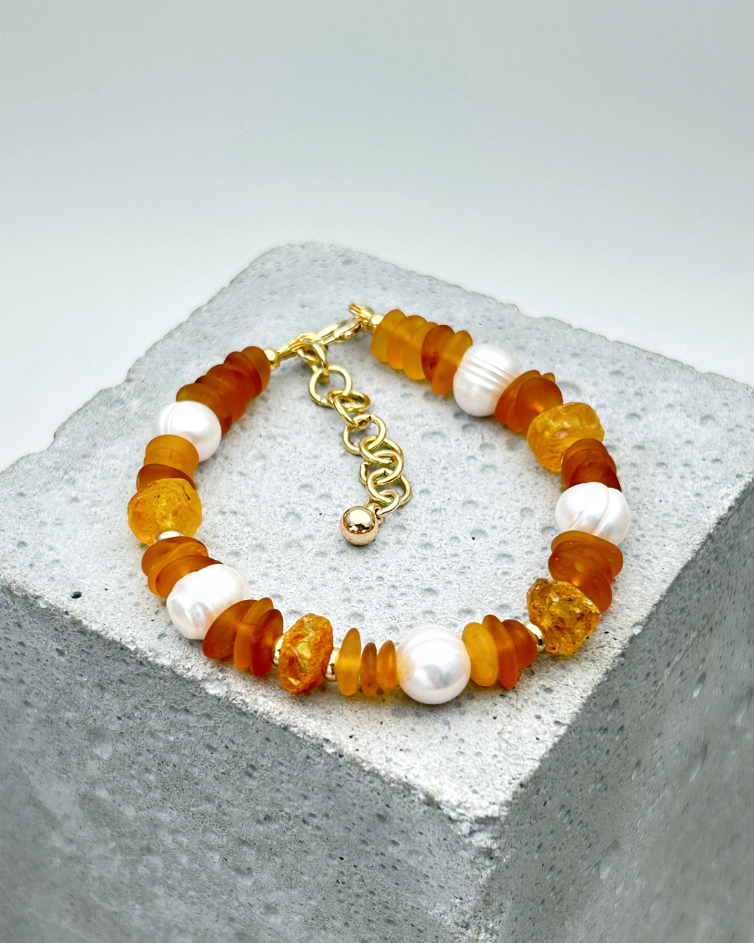 Кажется, жемчуг подходит вообще ко всему, поэтому мы добавили его и в этой подборке. Красно-оранжевый янтарь и молочный жемчуг дают очень благородное сочетание. Изделие мы дополнили фурнитурой золотого цвета. В качестве основы мы взяли ювелирный тросик, поэтому понадобится сделать закрепку, подробнее о процессе закрепки вы можете прочитать в нашем статье "Как закрепить ювелирный тросик".
