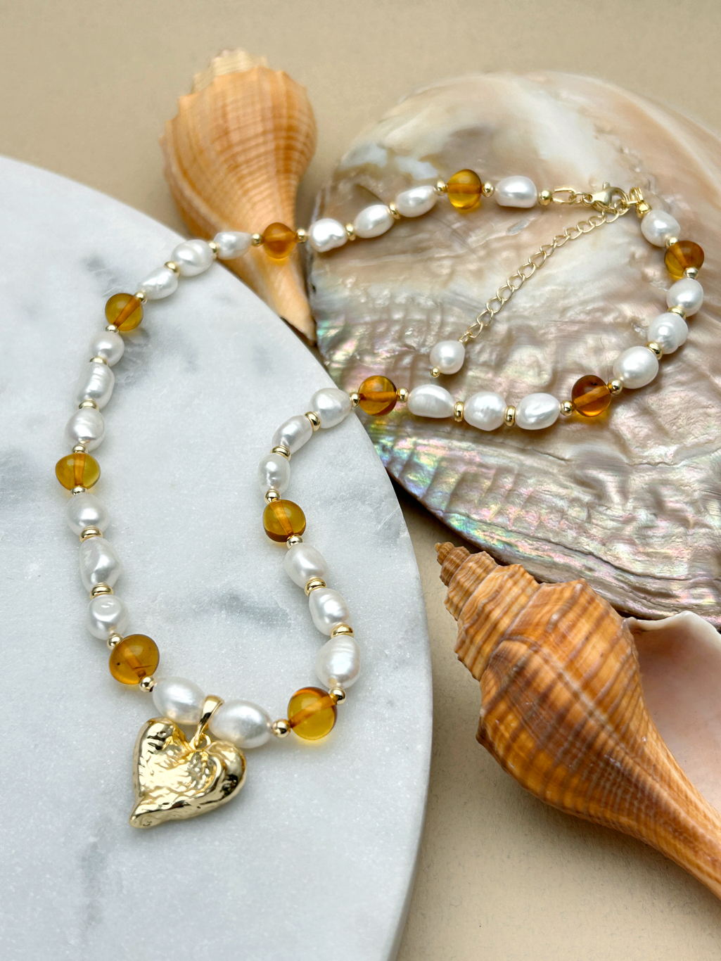 В этом колье мы сочетаем два вида фриформ бусин: жемчуг и янтарь. Пропорцию можно поменять местами: чередовать три бусины янтаря и одну бусину жемчуга. Но даже в этом случае рекомендуем по бокам от сердечка устанавливать именно жемчуг, чтобы золотое сердечко не сливалось с теплым янтарем.