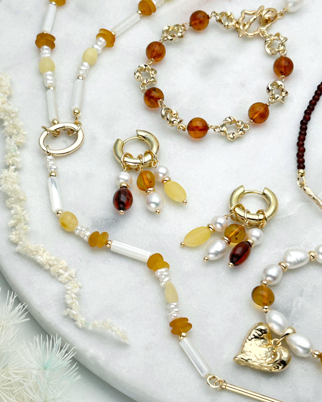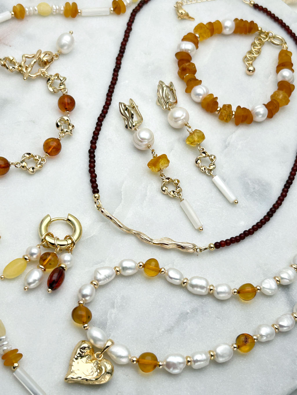 Колье с жемчугом и янтарем фриформ