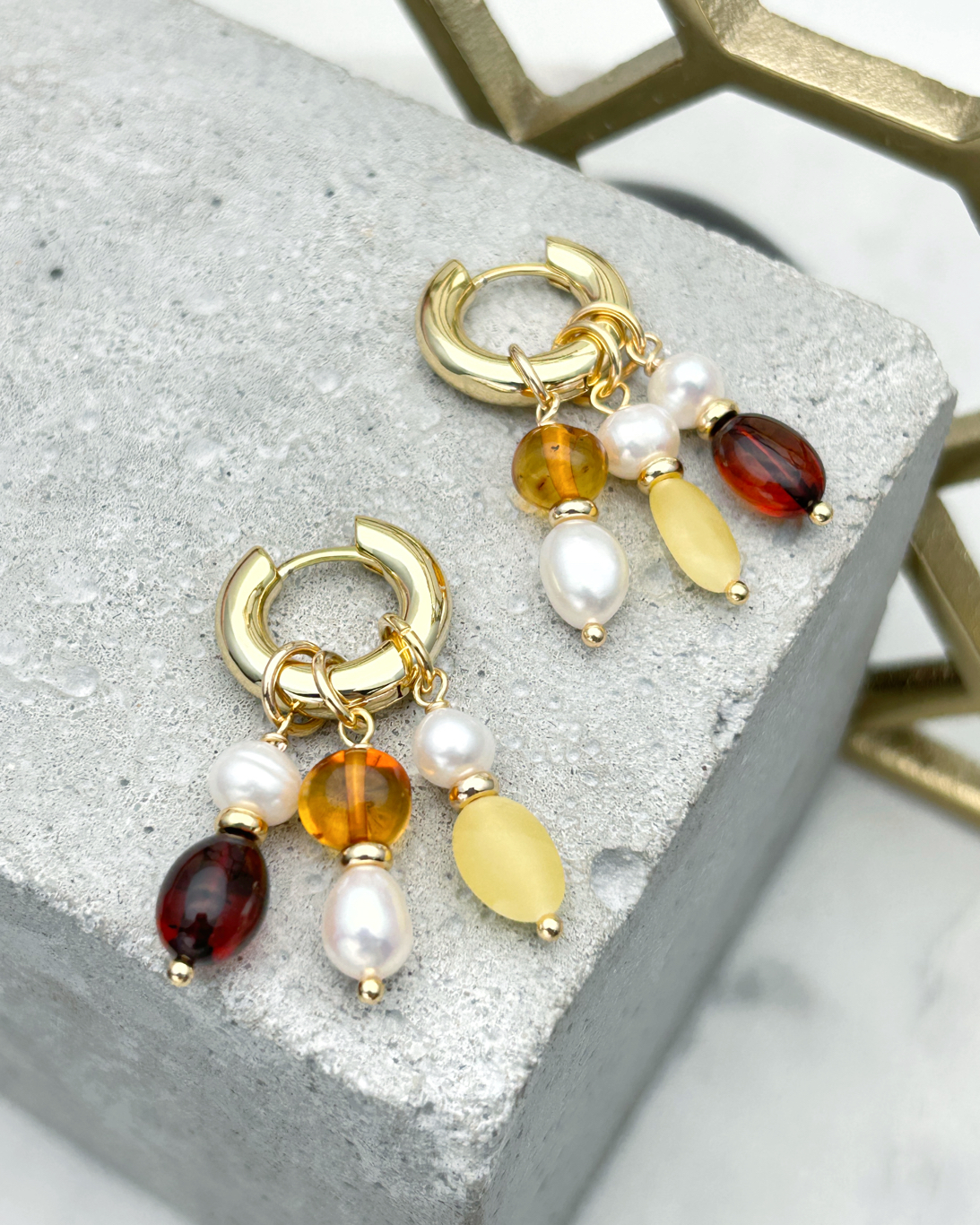 В сережках мы снова решили сочетать жемчуг с янтарем. Получилось так, что янтарь свободной формы похож на капельки стекла! Мы взяли прозрачный и матовый янтарь, чтобы серьги смотрелись более фактурно. А петельки на пинах сделали с намоткой, чтобы закрепка была прочнее. Как делать такую закрепку рассказали в нашей большой статье о пинах.