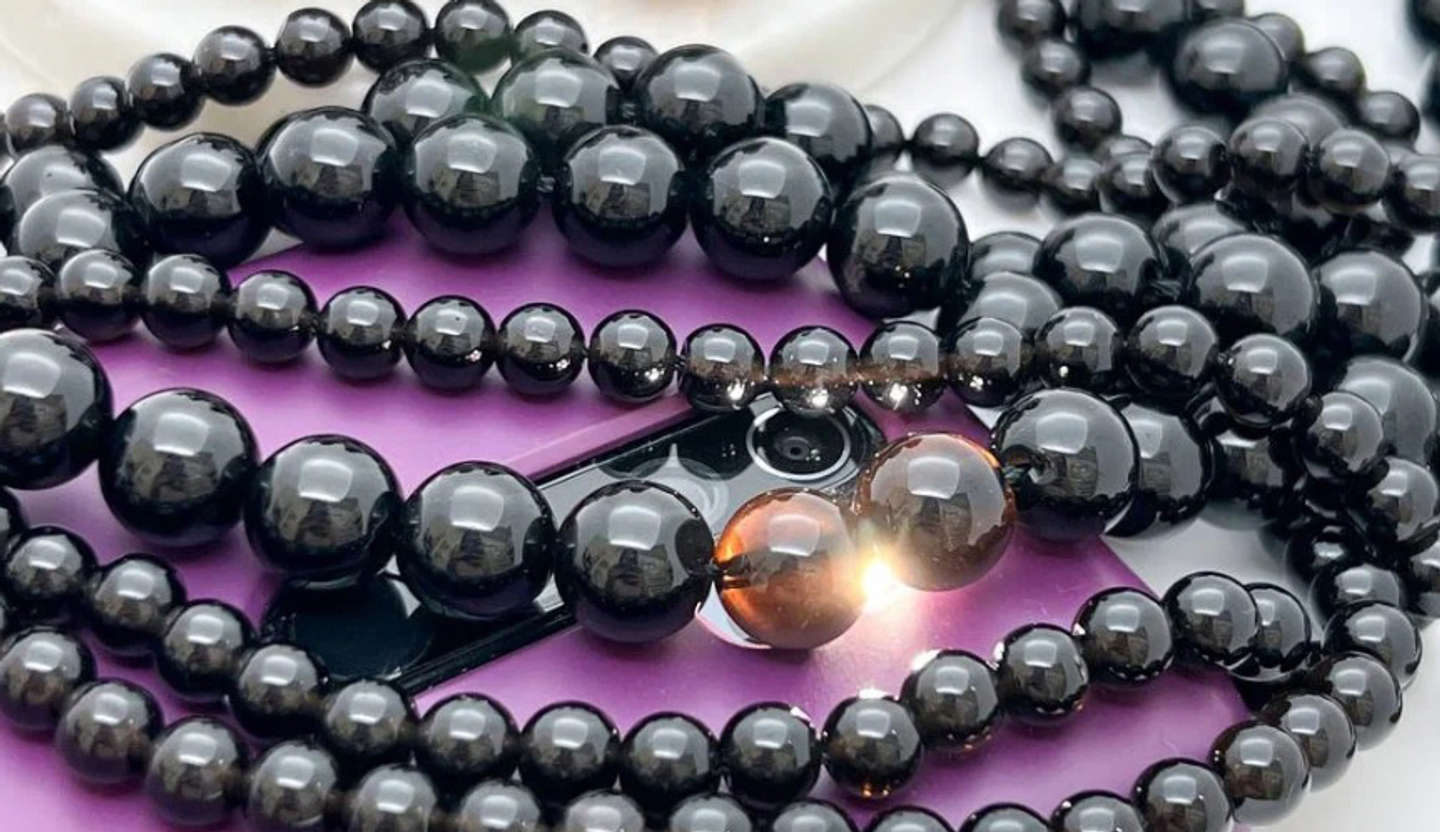 Теперь посмотрим на наши бусины. По сравнению с большинством образцов из музеев, которые я прикрепила к статье, они довольно мелкие. Если поднести вплотную фонарь, то бусина действительно просвечивает. Если же вы просто держите бусины в руках или пробуете смотреть на просвет на небо (не на солнце, а к примеру, когда есть облака), то просветов, видимых глазом, нет. Не вижу никаких расхождений с определениями выше из-за этого просвета фонарем - во-первых, размер бусины 10 мм, что может быть сопоставимо с толщиной "тонкой" пластины или образца 1 см для исследования коэффициента прозрачности (писала о нем выше), а, во-вторых, даже в строгих определениях эта самая полупрозрачность упоминается. Думаю, что если бы бусины были еще немного крупнее (например, не 10, а 15-20 мм), то, возможно, он бы уже и фонарем не просвечивался. Ну а глазом этот цвет видится однозначно черным (также приглашаю посмотреть). Чем не морион?