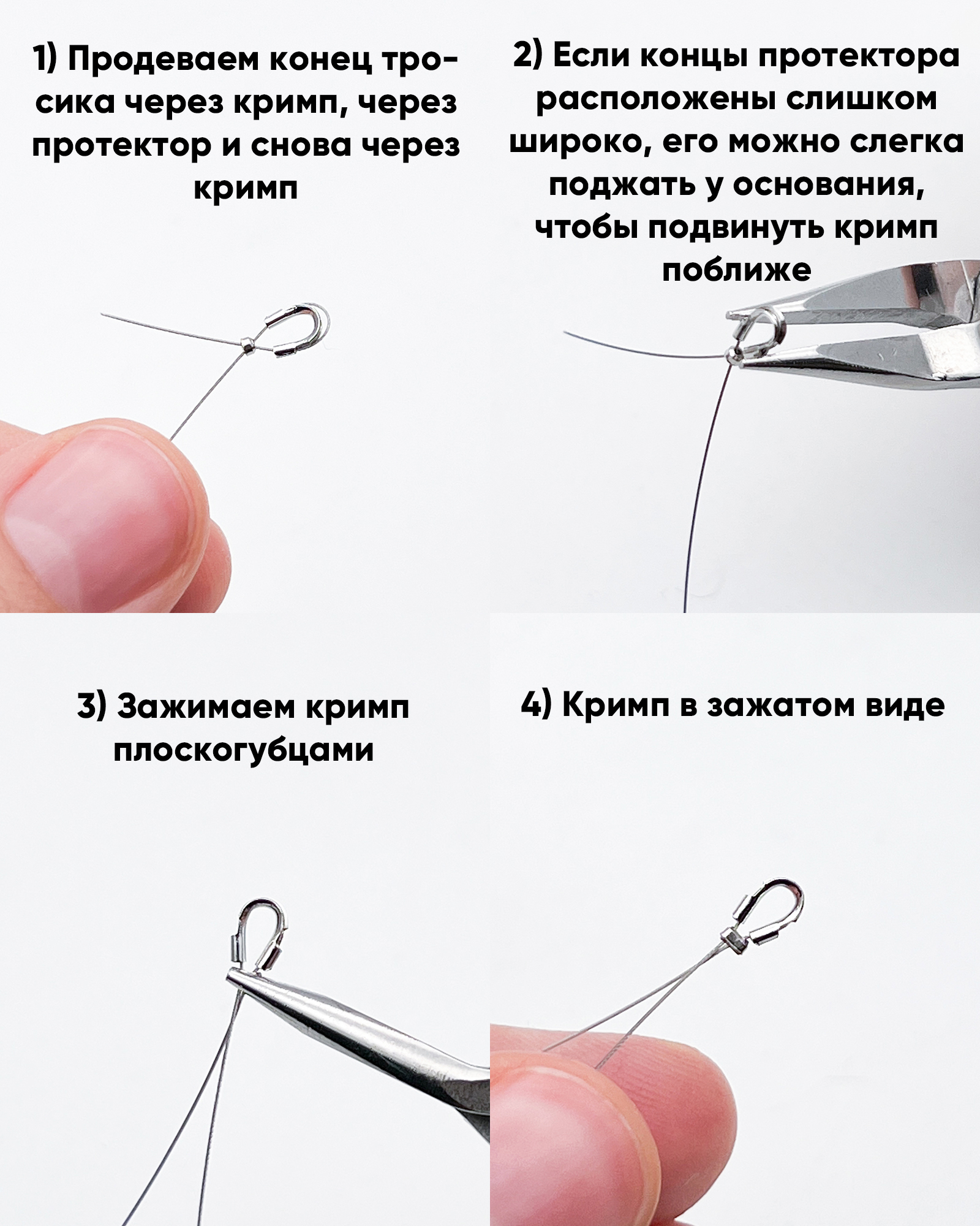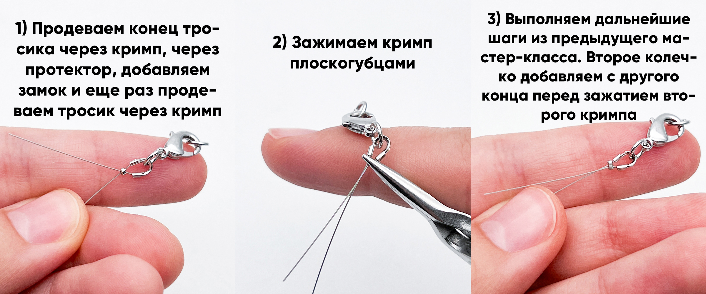 В этой статье мы покажем, как сделать классическую закрепку ювелирного тросика. Если вы начинающий мастер, то осваивать закрепку тросика мы рекомендуем именно с этого способа. Это универсальная закрепка, которая подойдет для большинства изделий.