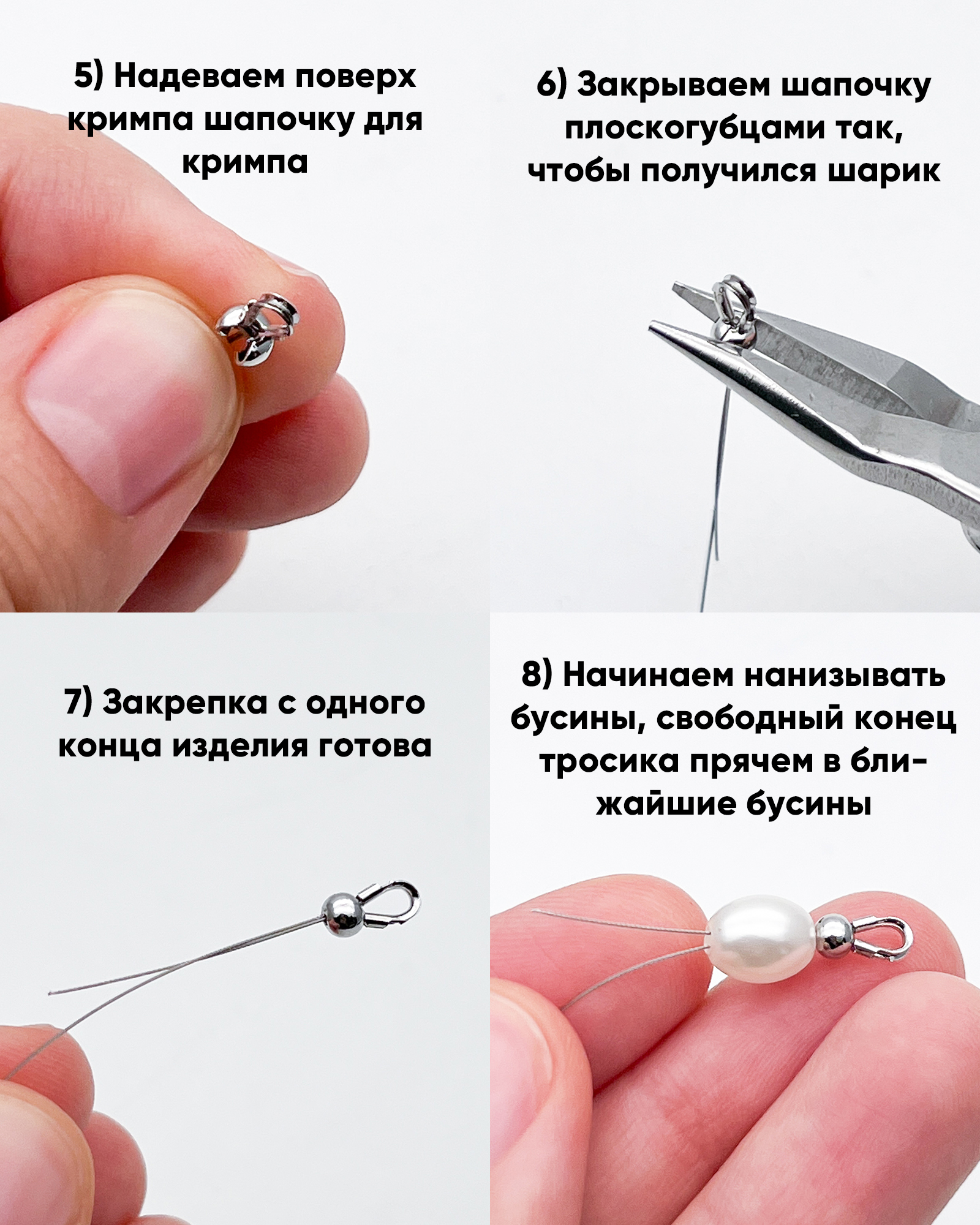 Здесь же упомянем только один нюанс перед тем, как начать: если вы уже знаете, какой длины хотите изделие, то выполняйте шаги в том порядке, в котором мы показываем их на фото - сначала закрепка одного конца, потом набор бусин на тросик, потом закрепка другого конца. Если же не знаете или хотите отрегулировать длину по ходу сборки, то сначала наберите нужное количество бусин на тросик, приложите к себе изделие, добавьте бусины или снимите лишние по краям, а потом переходите к закрепке - сначала один конец, потом другой.