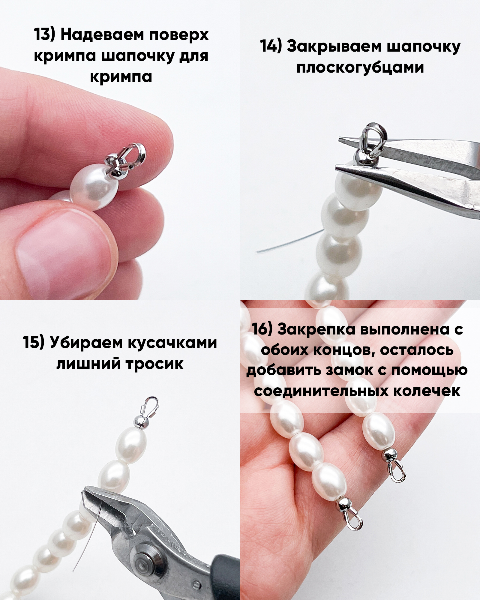 После того, как вы освоите классическую закрепку, очень рекомендуем прочитать нашу большую статью о закрепке: в ней мы показываем все возможные способы закрепки, перечисляем важные нюансы и учим подбирать фурнитуру по размеру. Так вы изучите всю теорию, которая нужна дизайнеру украшений, что тросик был закреплен надежно.