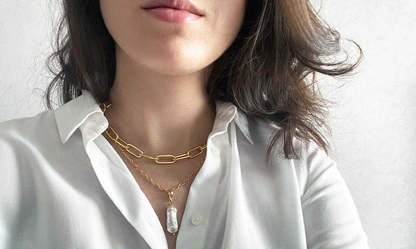 Для сборки колье нам понадобятся: соединительные колечки, пин с шариком, замки-лобстеры, замок-тоггл, два вида цепочки, кримпы, каллоты, коннектор-кольцо, ювелирный тросик, жемчуг (можно взять любой формы или размера, подойдет даже самый простой круглый, а также натуральные камни; я выбрала вытянутые бусины среднего размера), мелкие бусины 2 мм, чтобы вставить между жемчужинами, а также инструменты. В самом конце представлены ссылки на фурнитуру из этого мастер-класса в нашем магазине.
