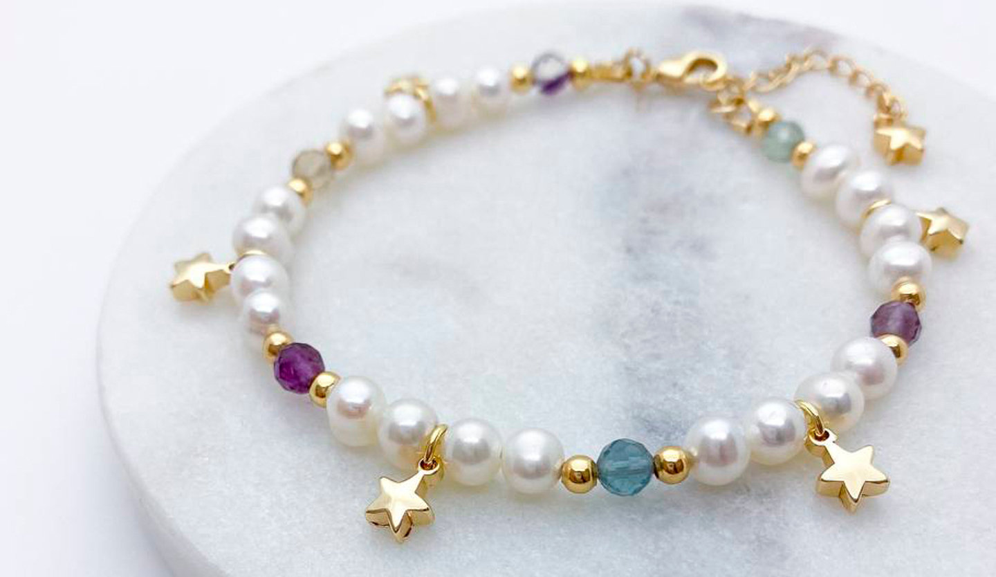 Нам понадобятся: жемчуг (мы взяли в размере 5*5,5 мм), мелкие граненые бусины (мы взяли 6 бусин флюорита 4 мм, выбрав максимально широкую палитру его оттенков, но можно сделать и более однородный по цвету вариант), любые мелкие подвески, бусины-разделители (мы взяли 3 мм), карабин (в нашем случае размер карабина 10 мм), ювелирный тросик 0,3 мм (мы взяли золотой, но также сюда хорошо подойдет жемчужный), соединительные колечки 4 мм, кримпы 1,2 мм, шапочки для кримпов 3 мм, протекторы, а также стандартный набор инструментов: плоскогубцы (тонкогубцы), круглогубцы и кусачки (бокорезы).