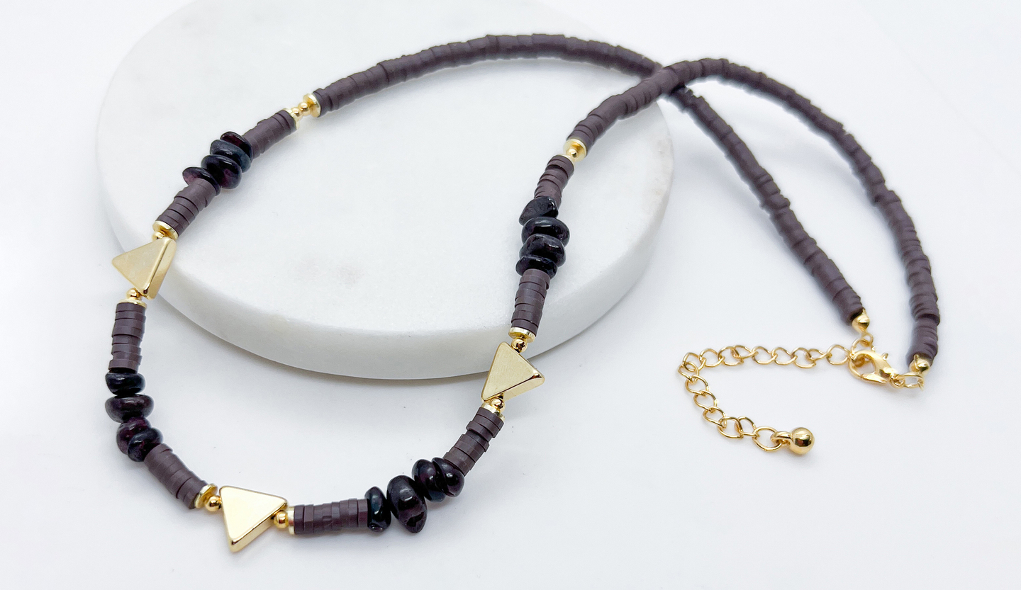 Итак, нам понадобятся: каучуковые бусины 4 мм (мы взяли в цвете шоколад), корейские разделители трех видов (диски 4 мм, круглые бусины 2,5 мм и треугольники), каменная крошка (мы взяли гранат, поскольку он хорошо сочетается с цветом каучука и золотой фурнитурой), ювелирный тросик золотого цвета толщиной 0,3 мм, все для закрепки тросика (каллоты 6*3 мм, протекторы и кримпы 2 мм), соединительные колечки (мы взяли 4,5 мм), карабин и инструменты (тонкогубцы, утконосы, бокорезы).
