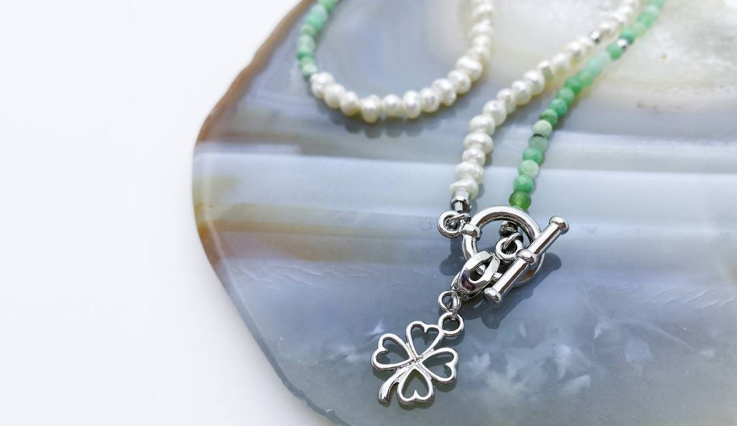 Итак, нам понадобятся (если на момент чтения каких-то товаров не будет в наличии — напишите нам, подскажем, чем заменить): хризопраз или любые другие мелкие граненые бусины (в данном случае использовался размер 3,1-3,3 мм, их понадобилось 60 штук), жемчуг (в данном случае использовали жемчуг примерно 3,7*4,5 мм, понадобилось 56 штук), разделительные бусины размером 2-3 мм, соединительные колечки 4 мм, бейл с замком, замок-тоггл (подойдет любой тоггл размером 13-14*16-17 мм), кримпы One Touch и протекторы, любая подвеска, белый тросик 0,3 мм и базовый набор инструментов (круглогубцы, кусачки, плоскогубцы).