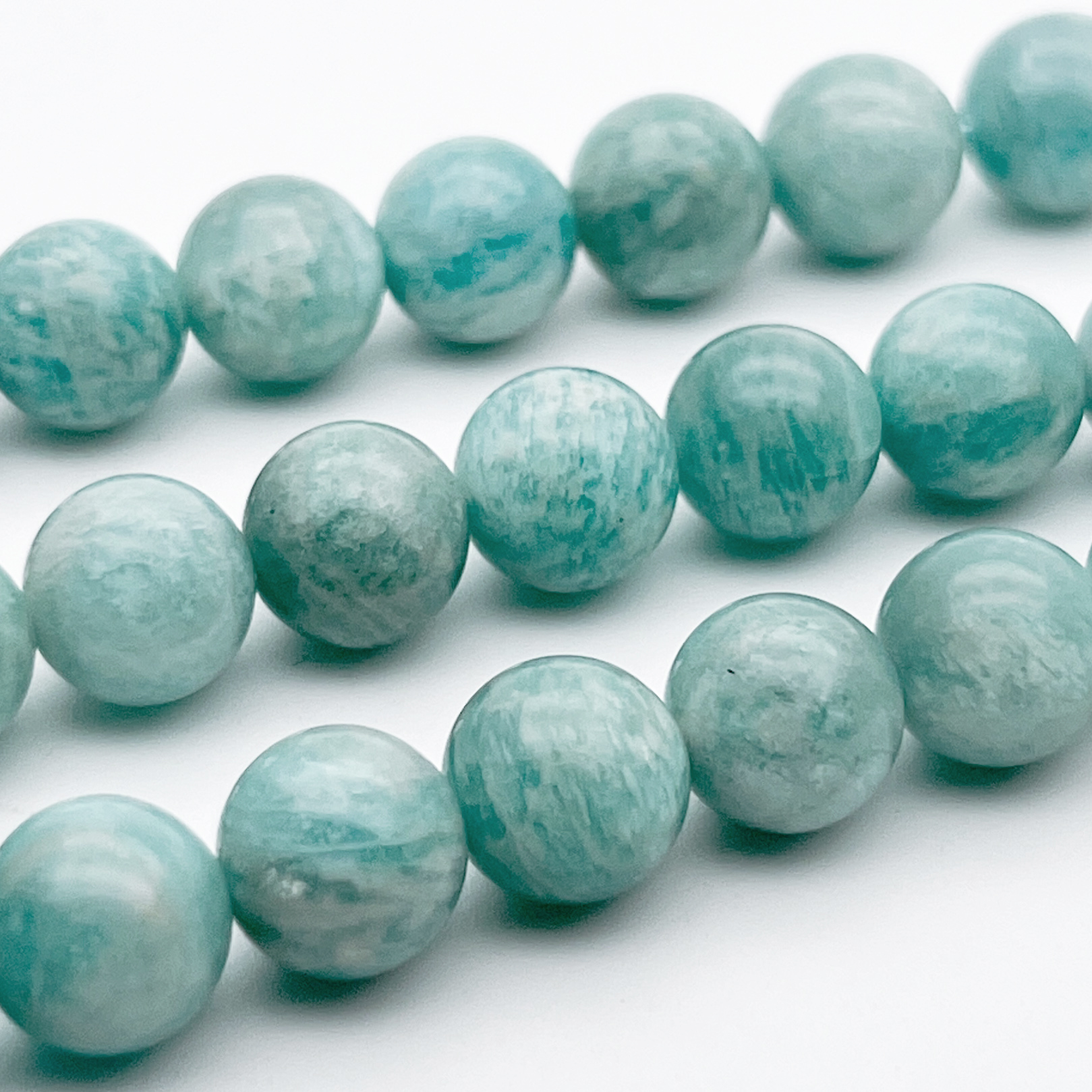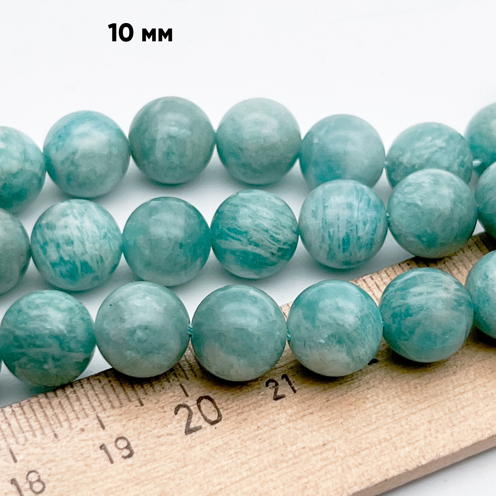 Бусины диаметром около 10 мм изготовлены из натурального камня амазонит. Это полностью природный материал: не прессованный, не имитация, цвет не усилен дополнительной тонировкой. Такая разновидность амазонита (бирюзовая основа с белыми прожилками альбита) высоко ценится мастерами.