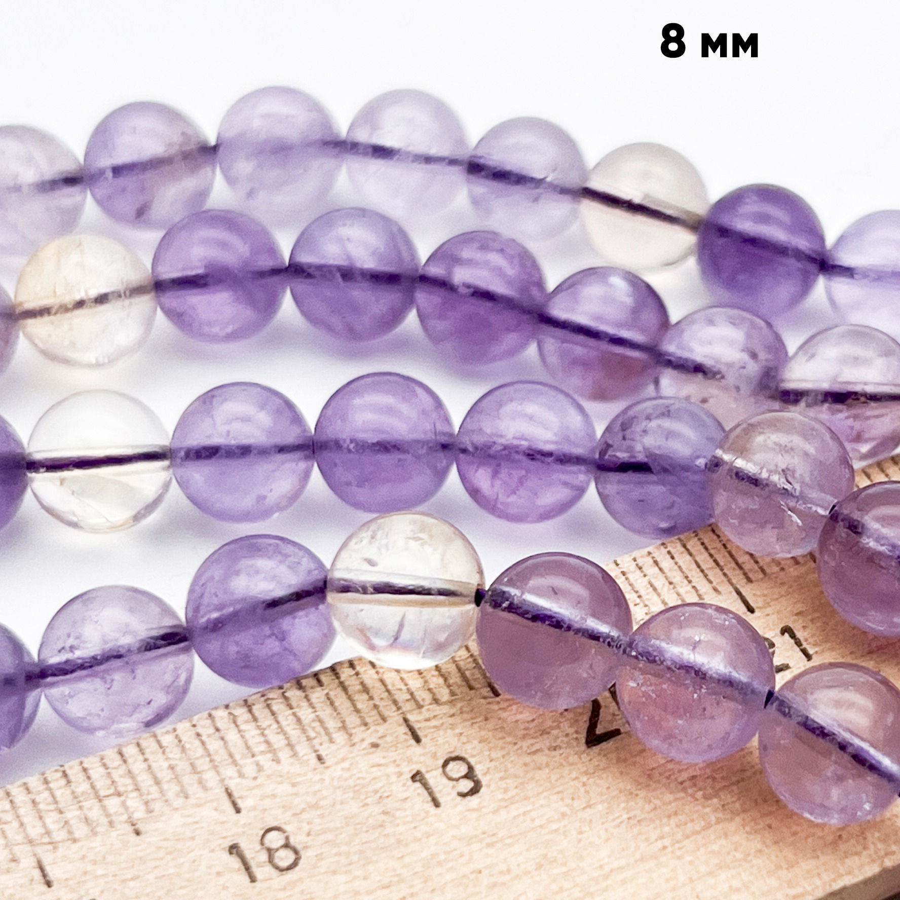 Размер бусин около 8,1-8,3 мм, а диаметр отверстий примерно 0,8-1 мм. Можно создать браслет на эластичной резинке или украшение с замочком на ювелирном тросике. О способах фиксации тросика рассказываем здесь.