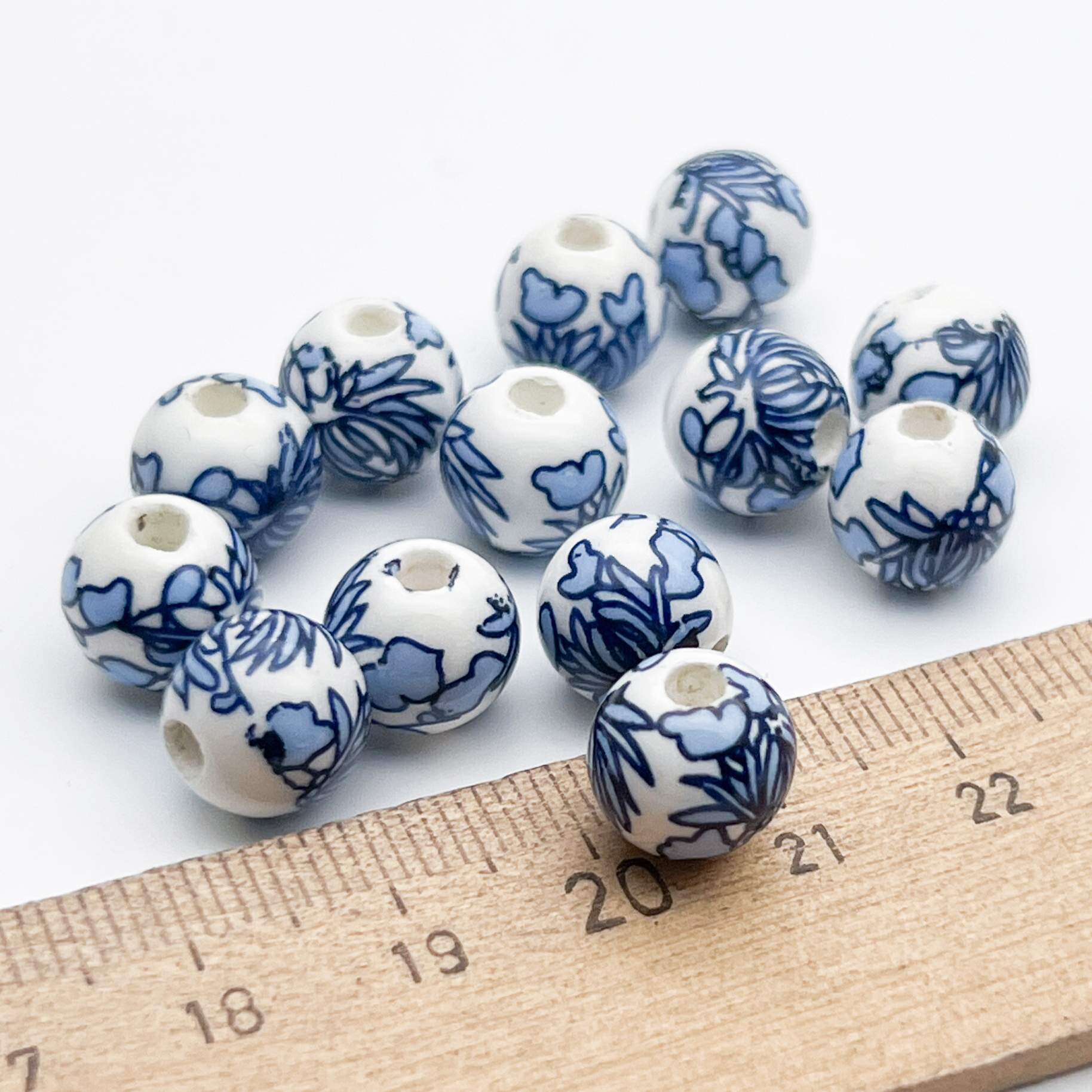 Бусины Шар с цветами, керамика, цвет синий, размер около 10 мм, цена за 1 шт