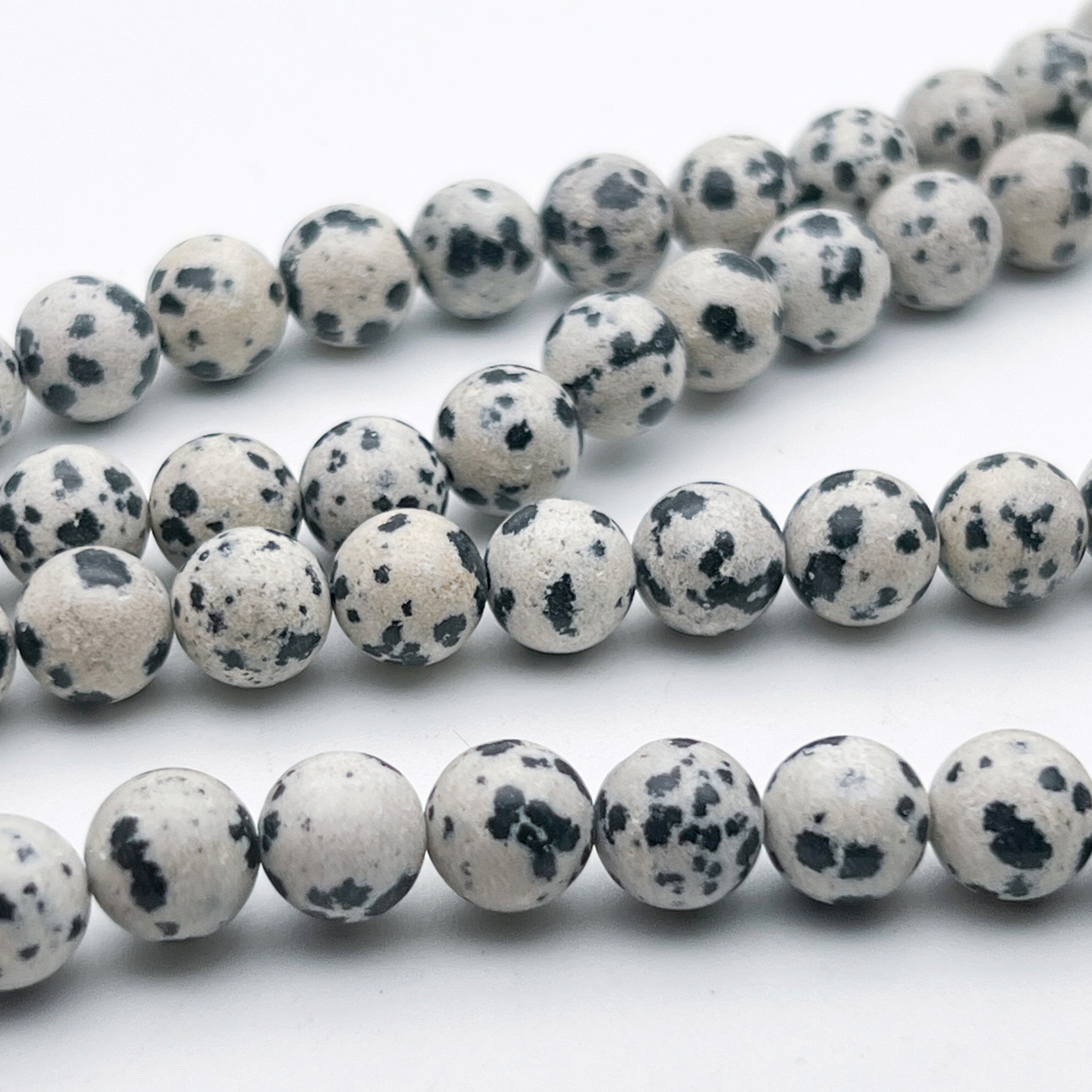 Бусины выполнены из натурального камня, который часто называют «Далматин». На самом деле, этот камень относится к порфирам - горная порода, в которой на общем фоне заметны включения другого минерала в виде мелких зёрен. Часто «далматин» ошибочно именуют далматиновой яшмой, но к яшмам он отношения не имеет. Подробно о путанице с яшмами и яшмовидными породами рассказываем здесь.