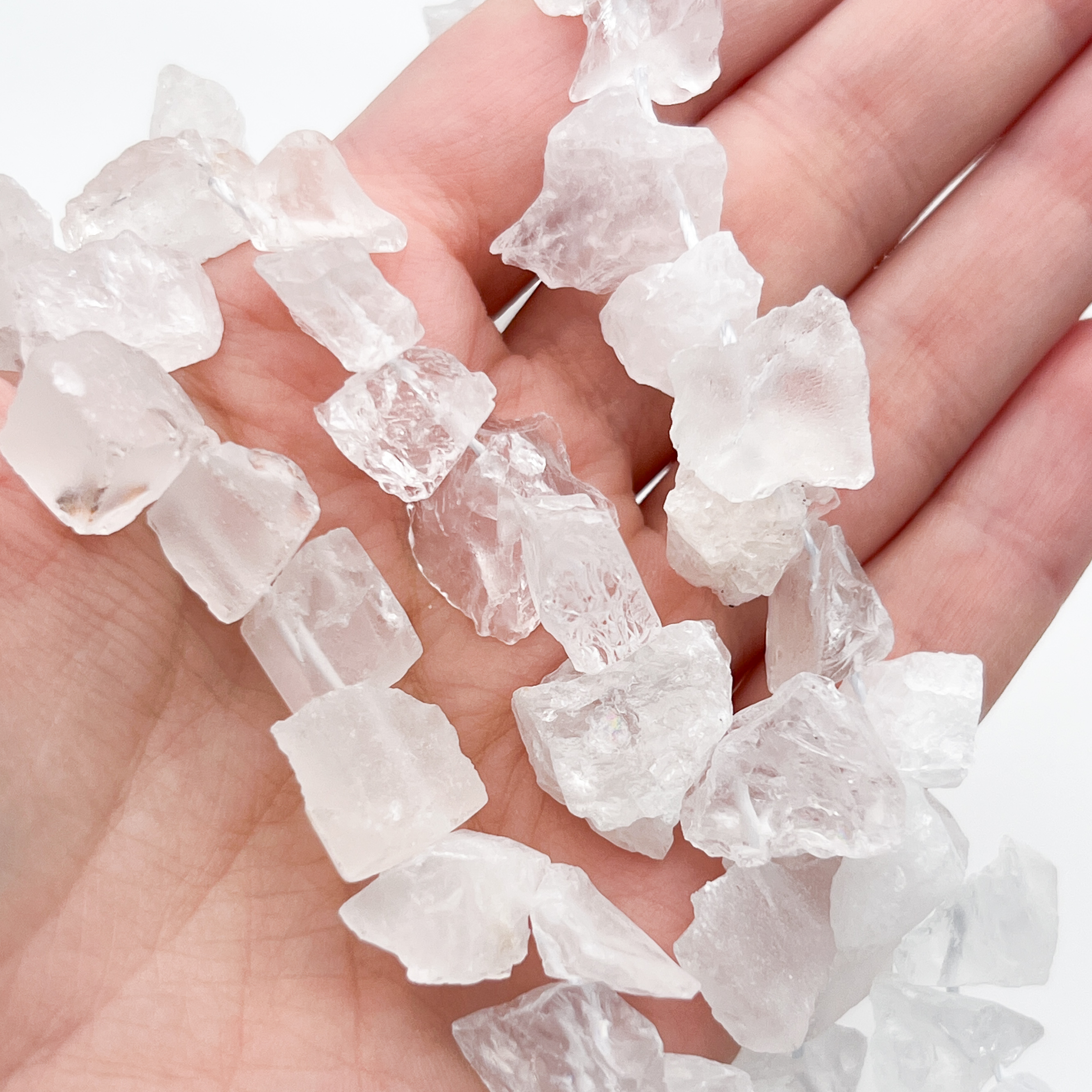 Есть ли данный товар - Кварц белый + горный хрусталь, необработанные бусины, размер около 7-12*10-14 мм, цена за отрезок 9-9,5 см (1/4 нити) в вашем шоуруме в Санкт-Петербурге?