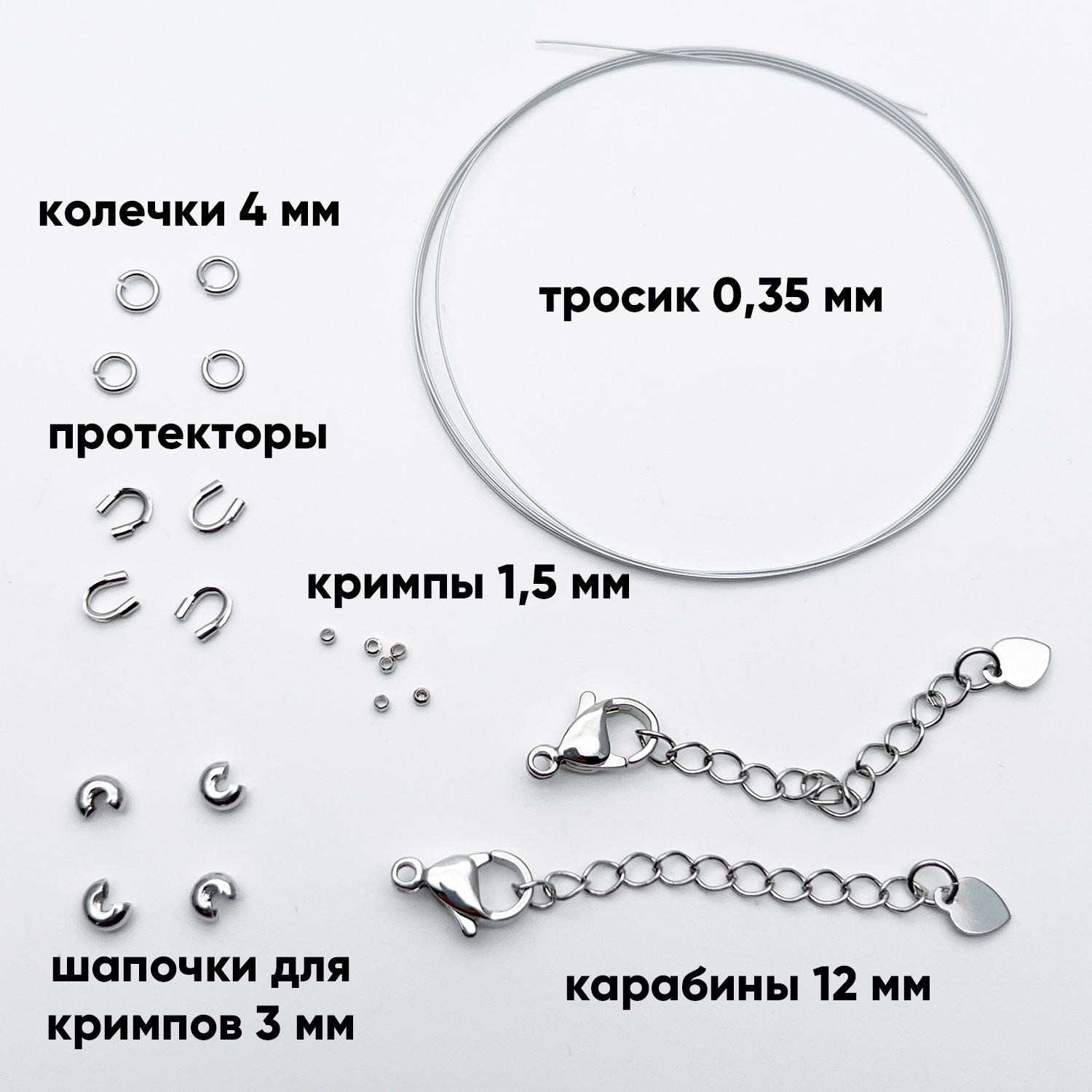 - для выполнения закрепки вам также понадобятся инструменты, они не входят в набор (тонкогубцы для зажатия кримпов и шапочек для кримпа, бокорезы для обрезки тросика, все инструменты представлены в этом разделе);