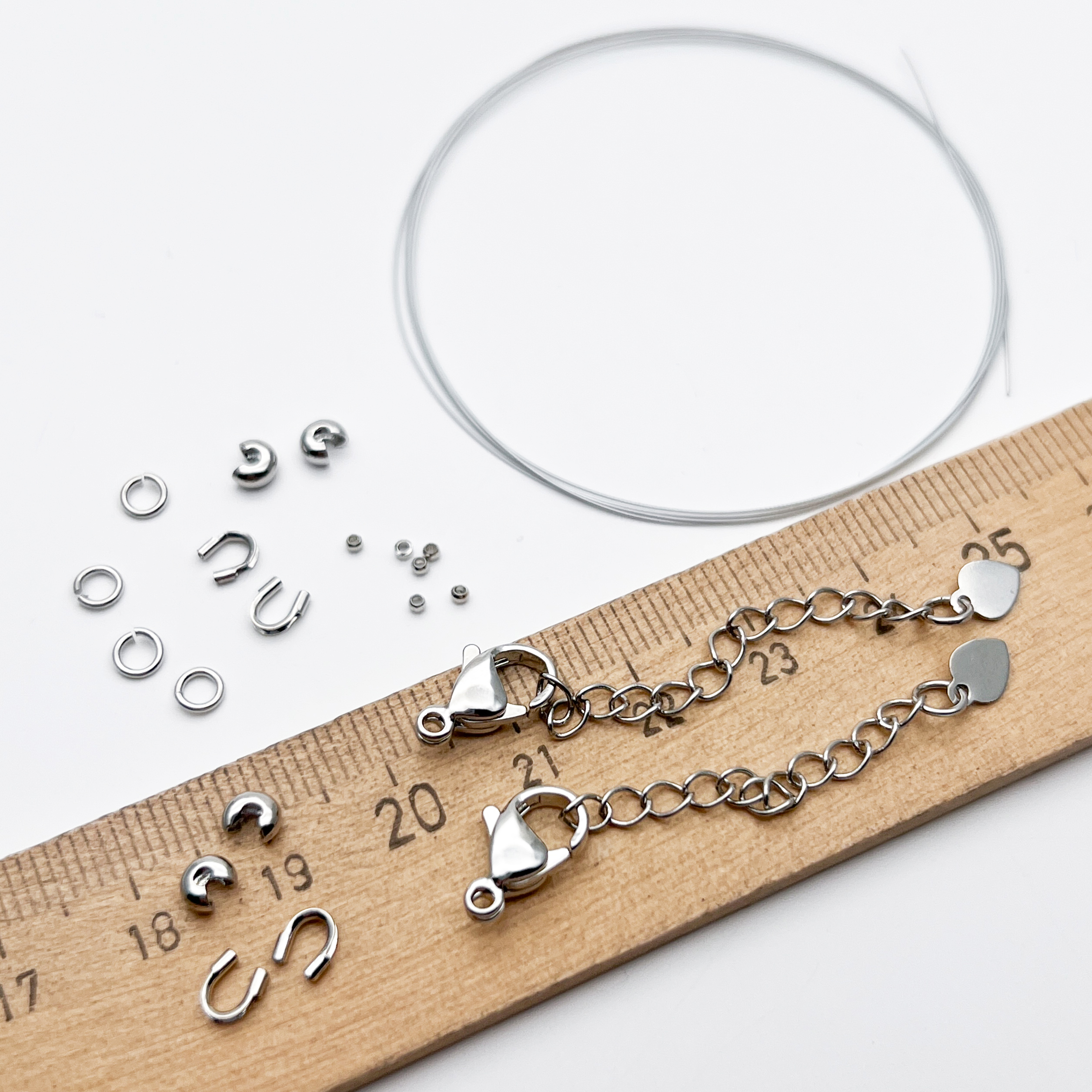 - на закрепку двух изделий вам понадобится 4 кримпа, однако мы кладем их с небольшим запасом, так как среди них могут попадаться кримпы с искривлениями внутри отверстий - в этом случае у вас будет замена (а еще иногда в процессе работы они укатываются или падают, и найти крошечный элемент размером 1,5 очень сложно);