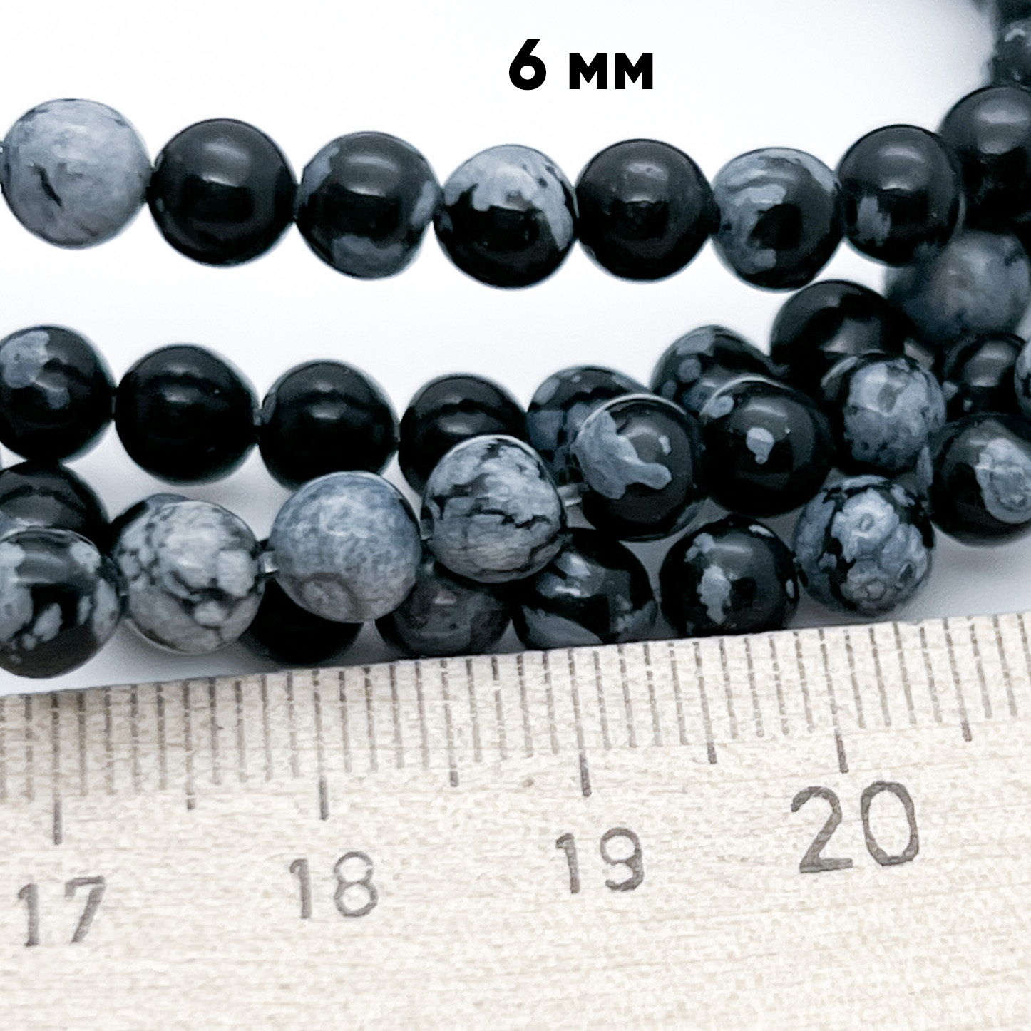 У обсидиана "Снежного" диаметр составляет 5,7-5,8 мм, что делает его удобным для использования в различных видах ручной работы. Камень имеет гладкую поверхность, которая хорошо подходит для создания браслетов, ожерелий, сережек и других украшений.