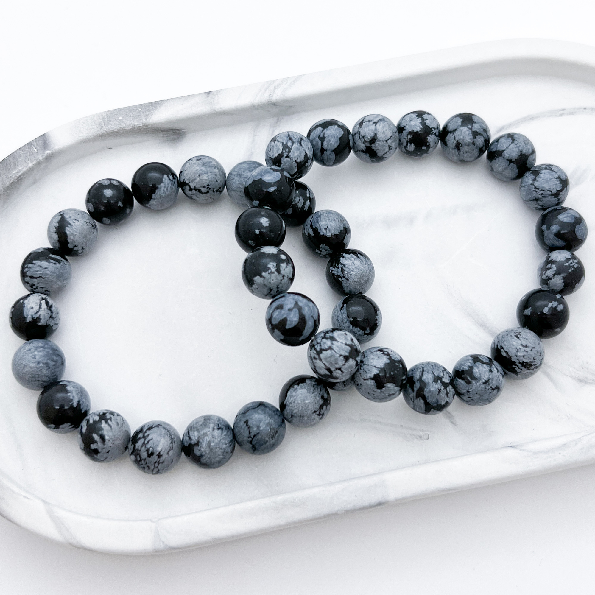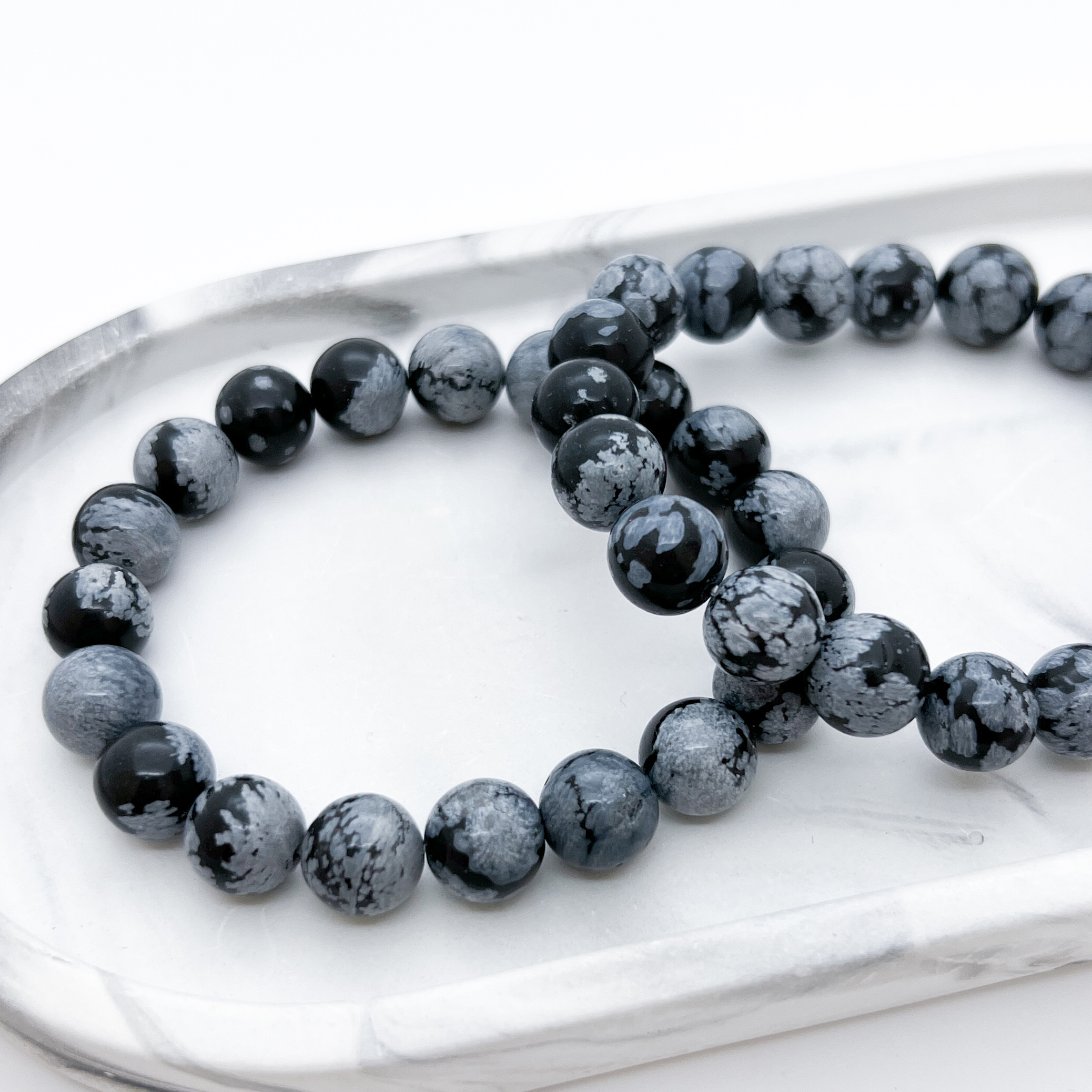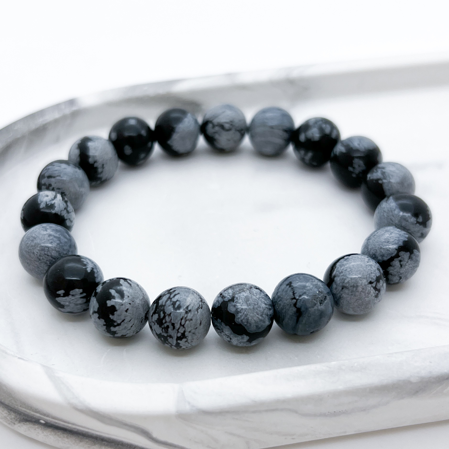 Браслет изготовлен из бусин натурального обсидиана, который за свой рисунок в виде хлопьев на черном фоне получил название "Снежный".