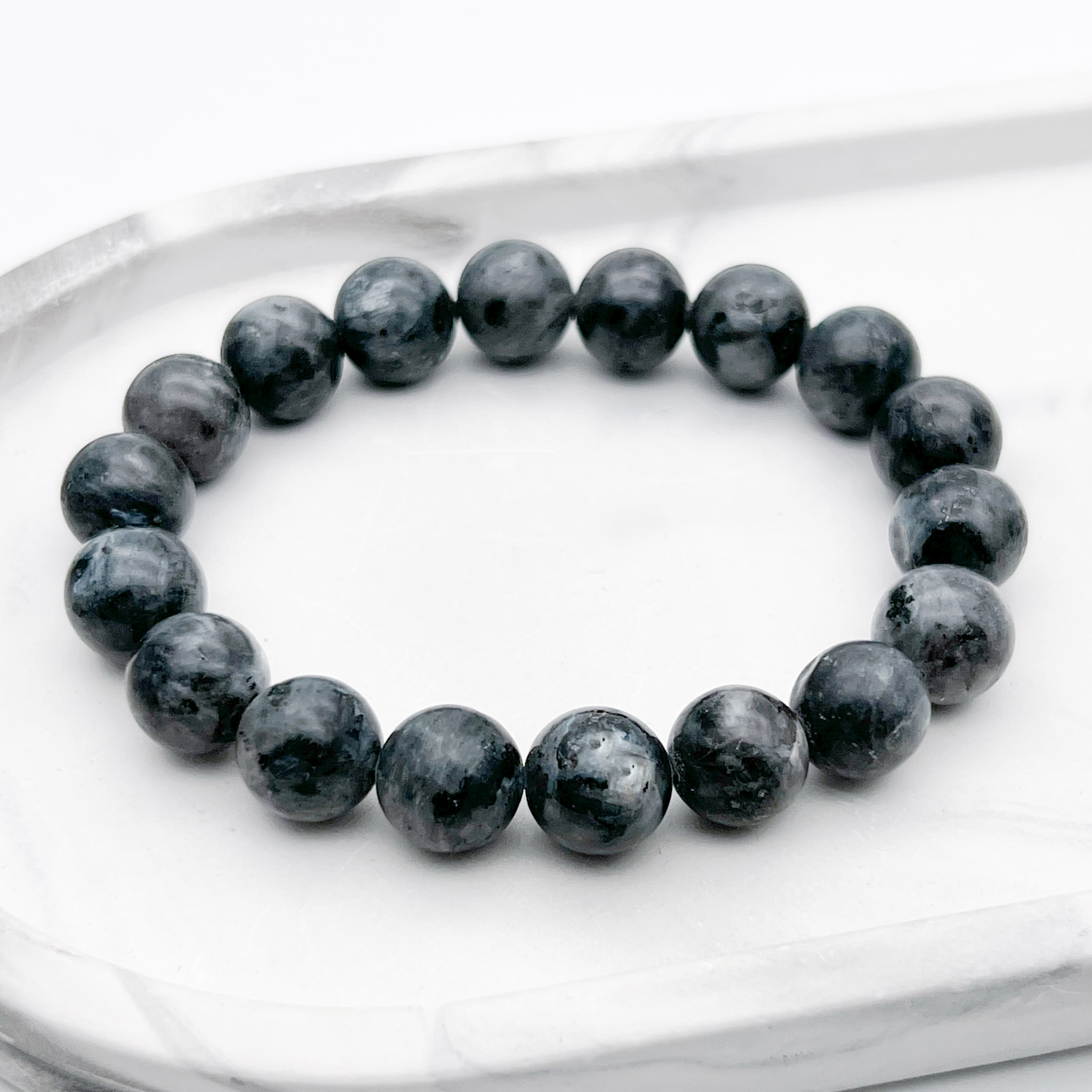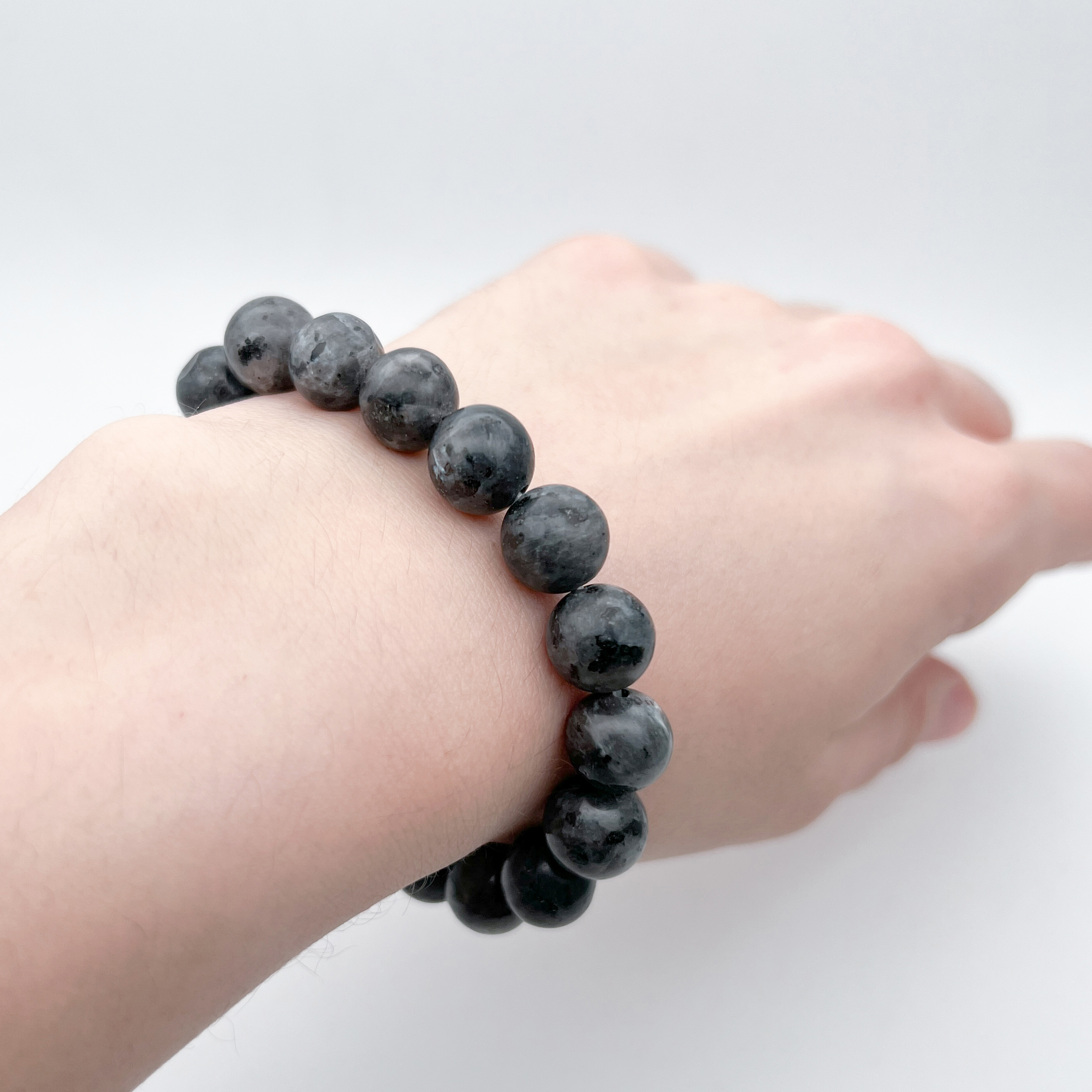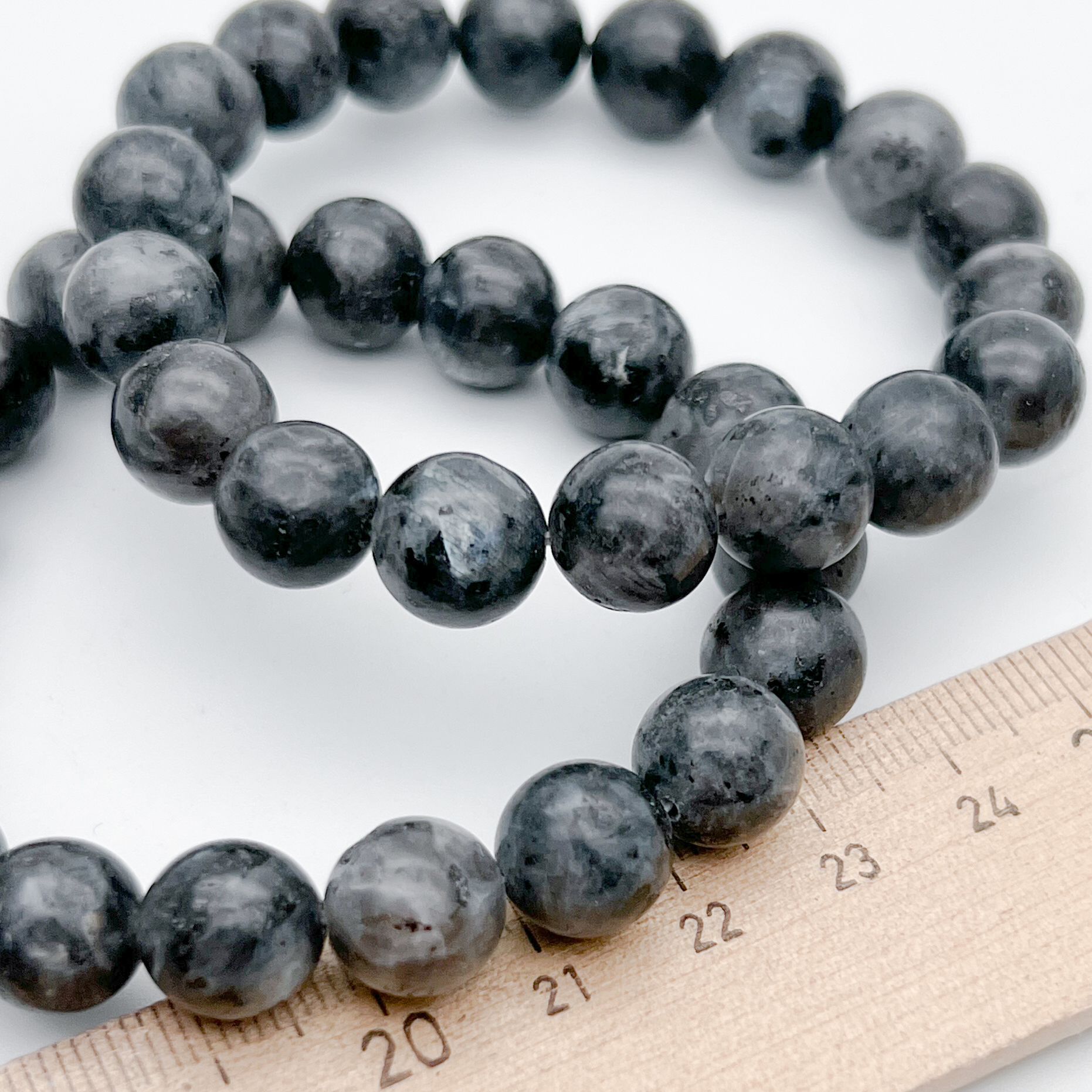 Браслет изготовлен из бусин натурального ларвикита - это порода, состоящая преимущественно из полевого шпата. Некоторые бусины имеют серебристый шелковистый перелив. Иногда такой камень ошибочно называют лабрадор, однако это неверно: лабрадор - это еще одна разновидность полевого шпата.
