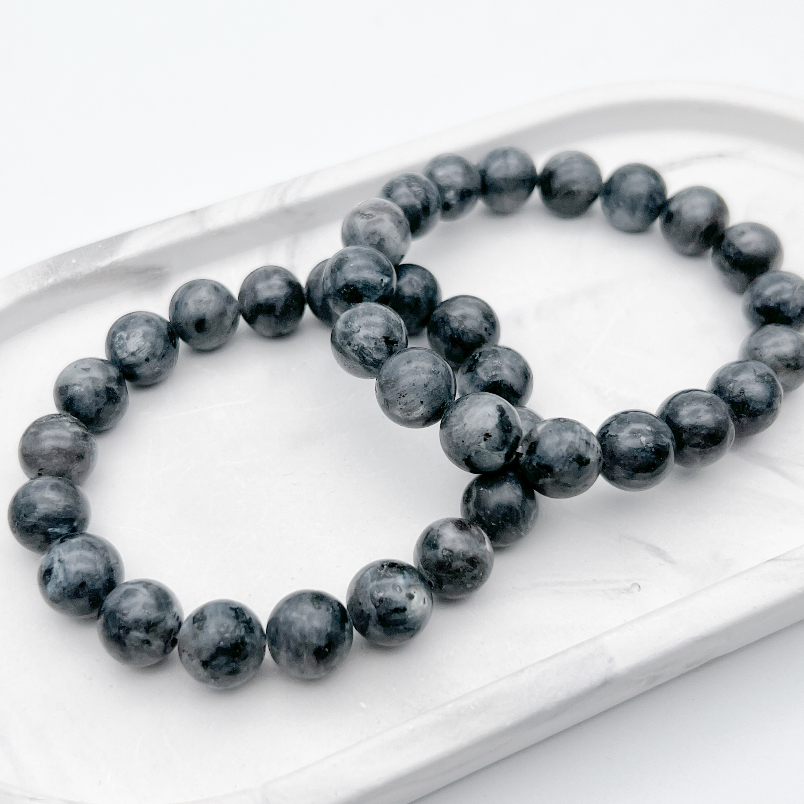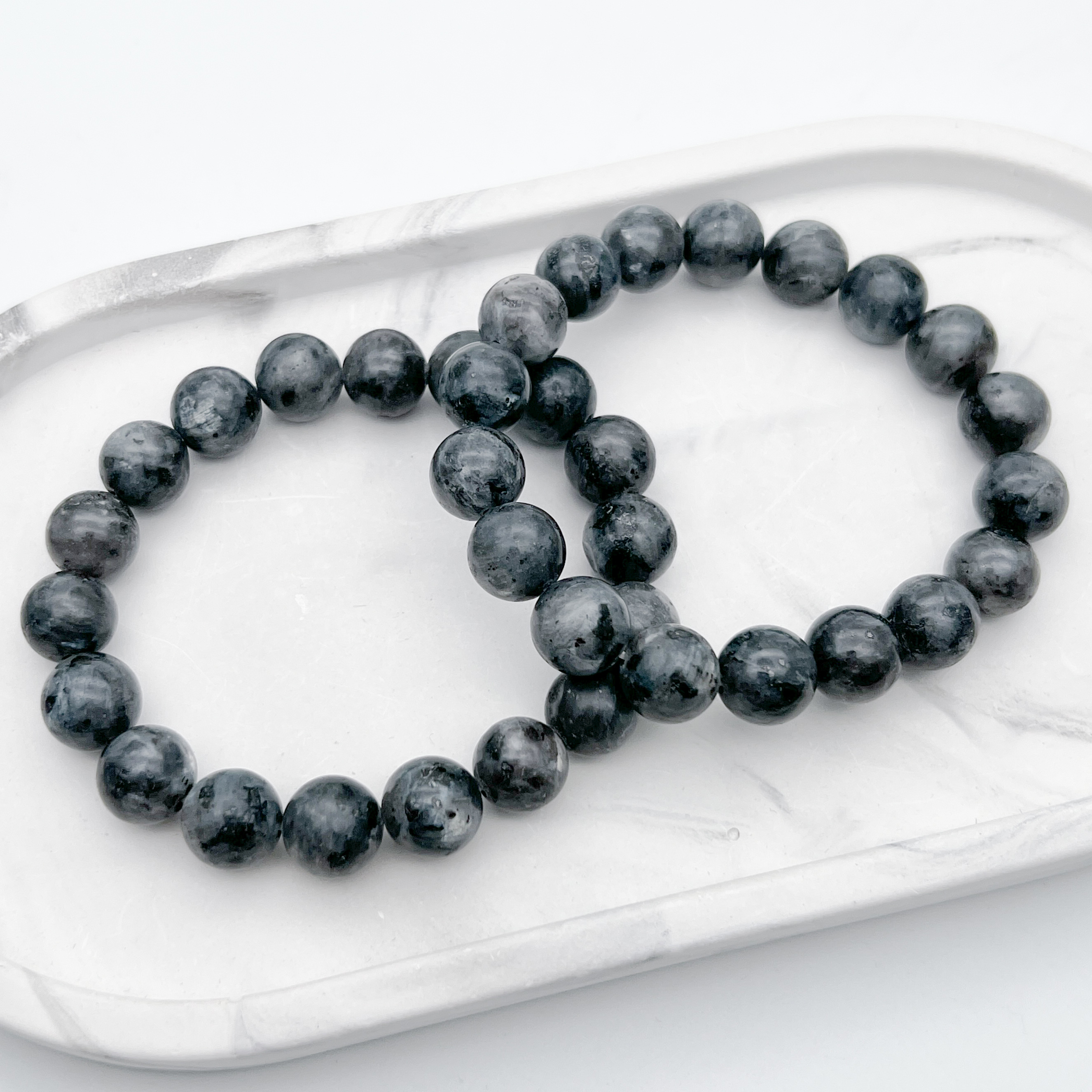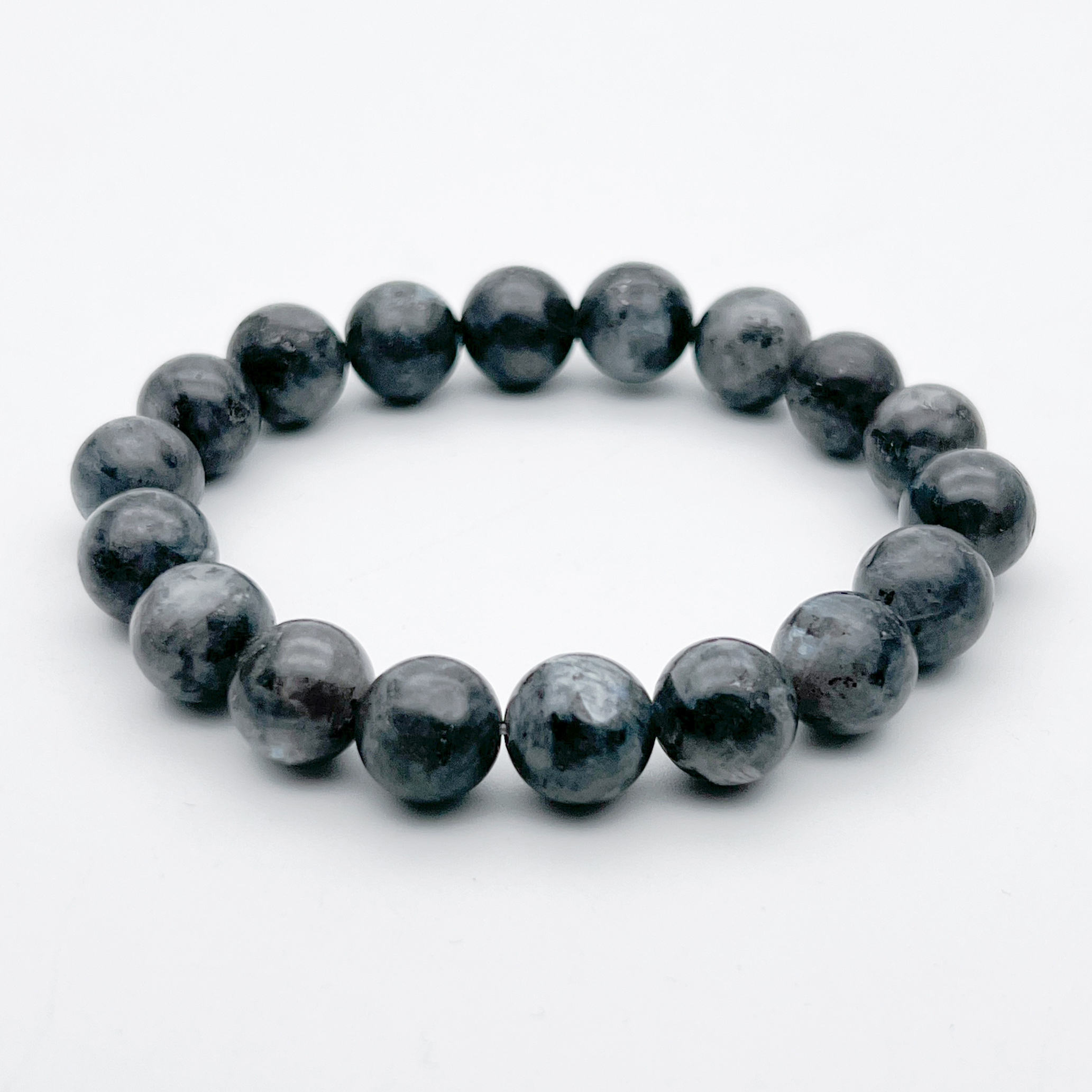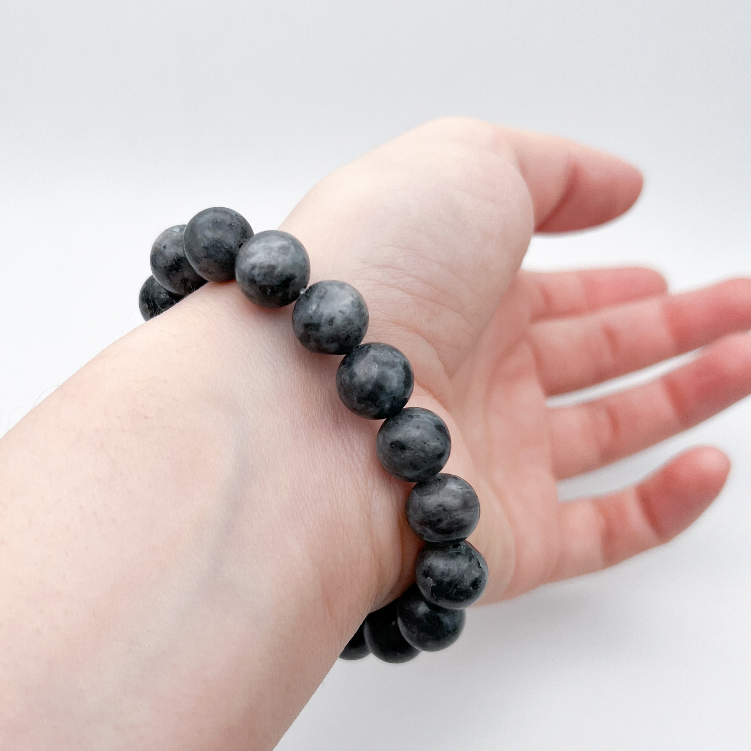 Браслет изготовлен из бусин натурального ларвикита - это порода, состоящая преимущественно из полевого шпата. Некоторые бусины имеют серебристый шелковистый перелив. Иногда такой камень ошибочно называют лабрадор, однако это неверно: лабрадор - это еще одна разновидность полевого шпата.