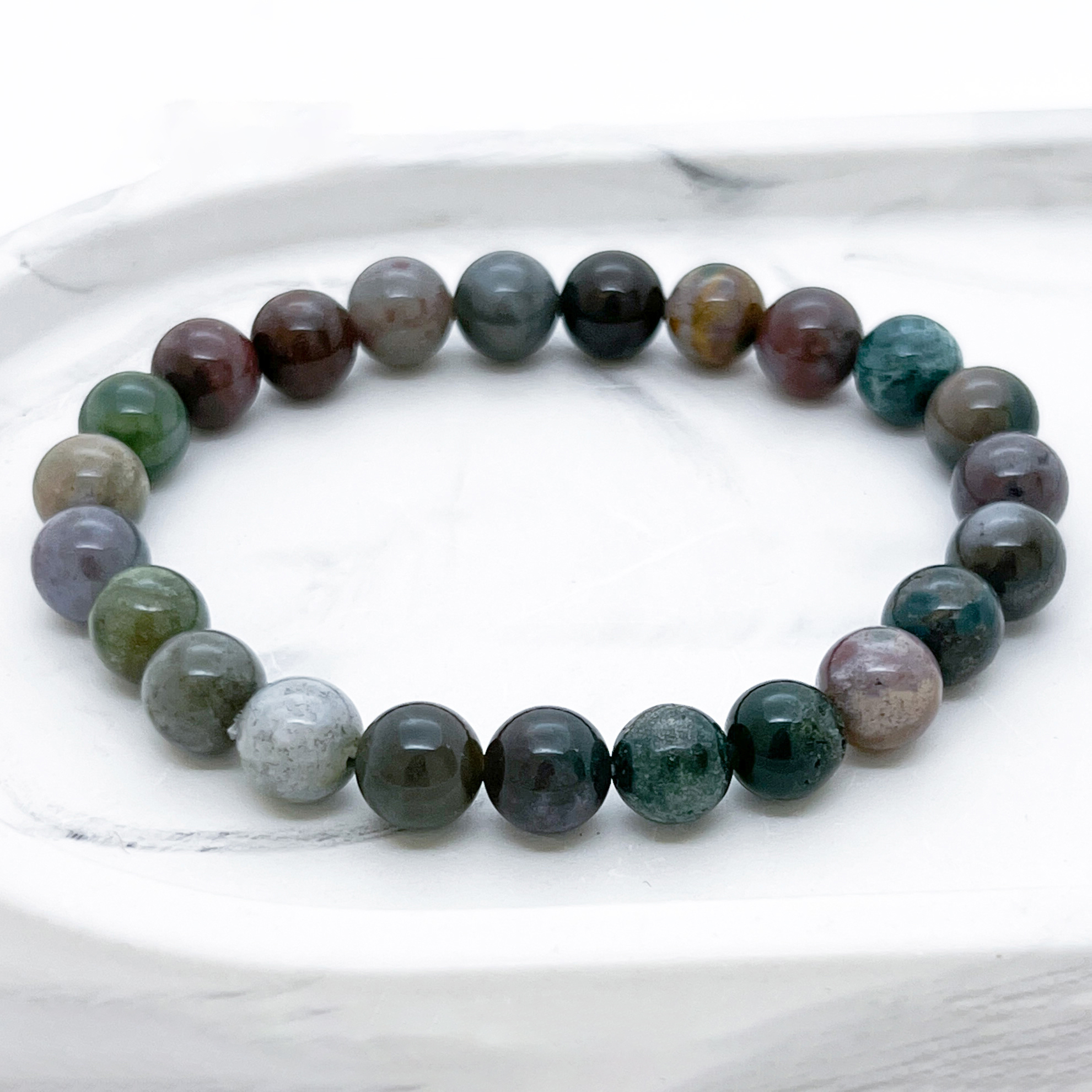 Браслет изготовлен из бусин натурального халцедона. В такой расцветке его также часто называют "индийский агат".