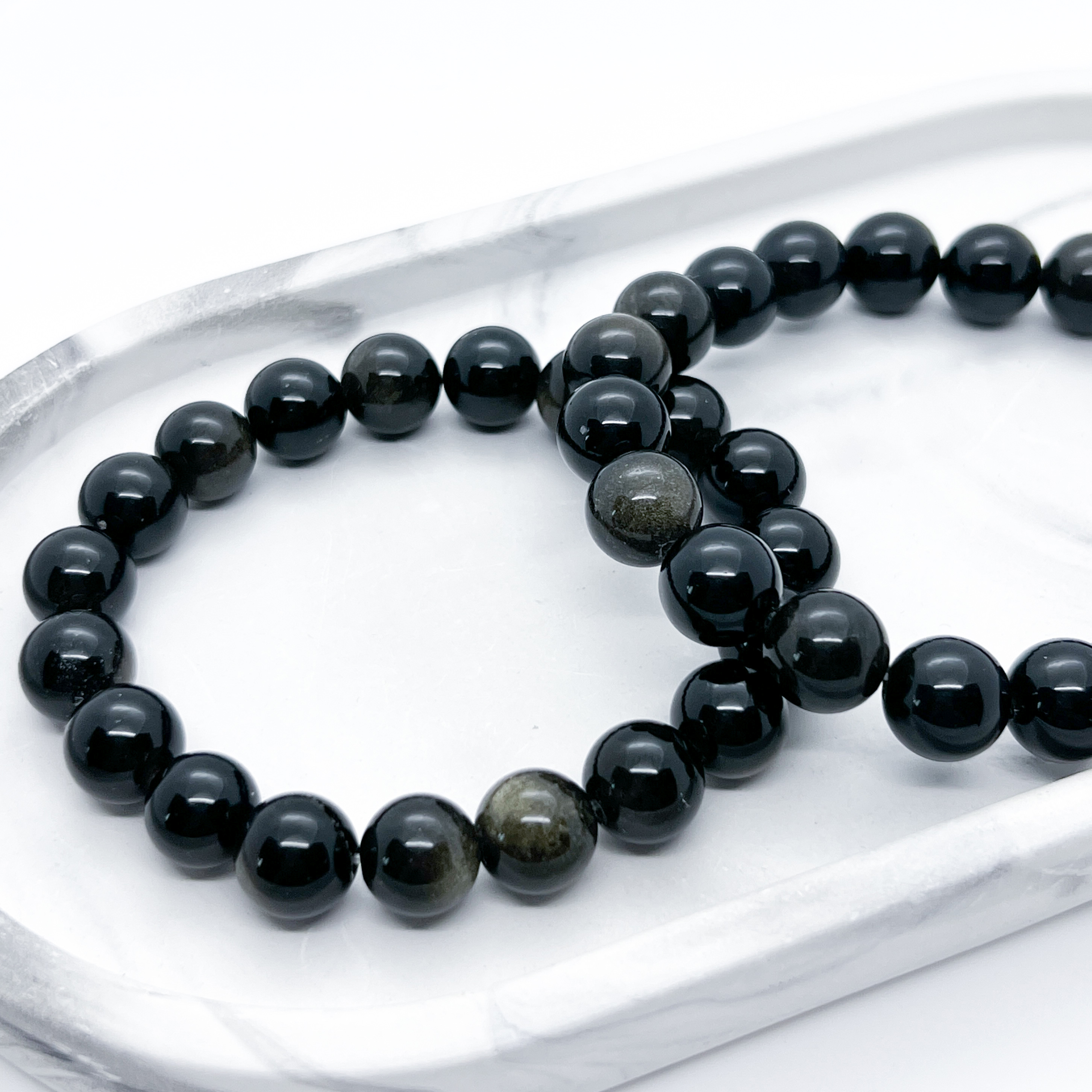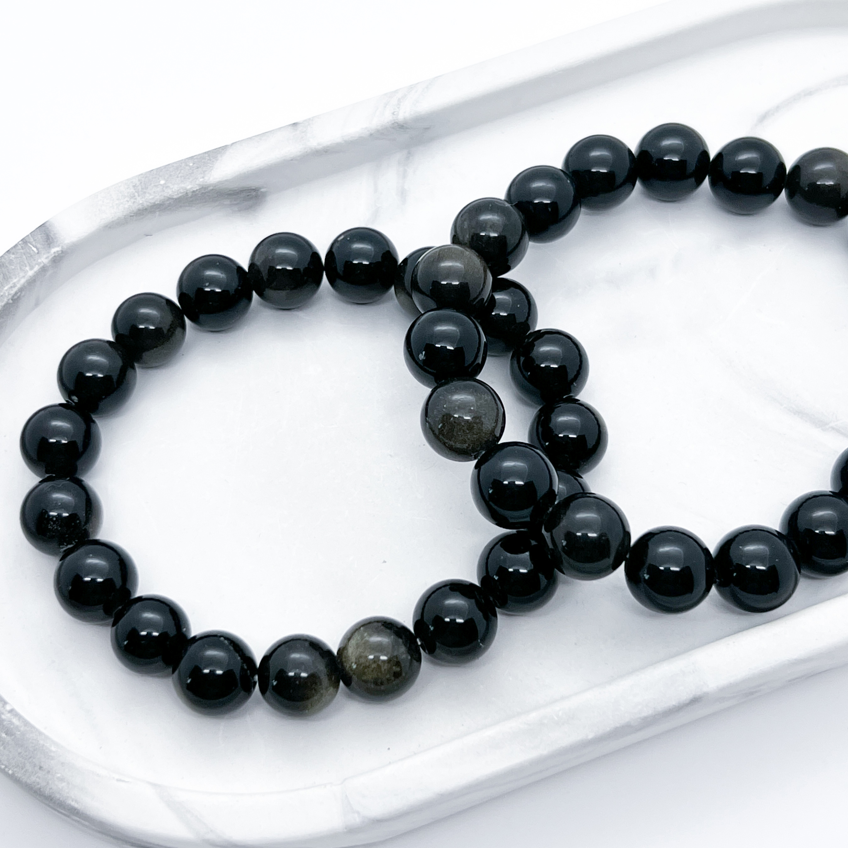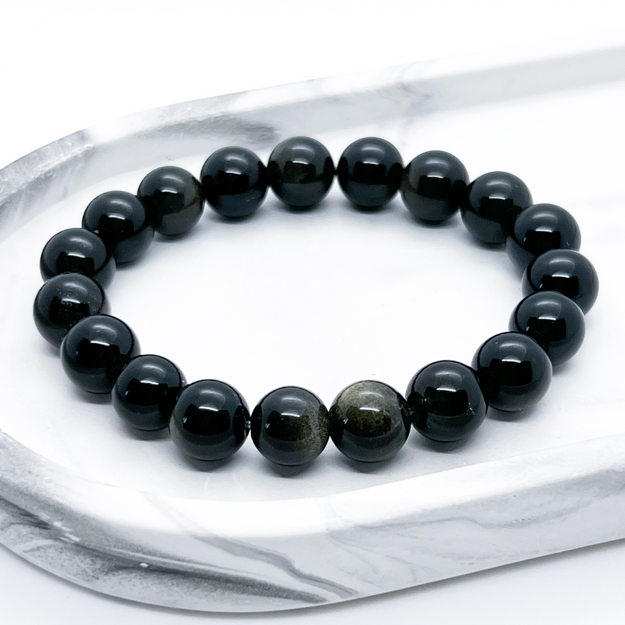 Браслет изготовлен из бусин натурального обсидиана с золотистыми включениями, которые видно, если вращать бусины под разными углами. Именно за такие включения данная разновидность обсидиана получила название "золотой".