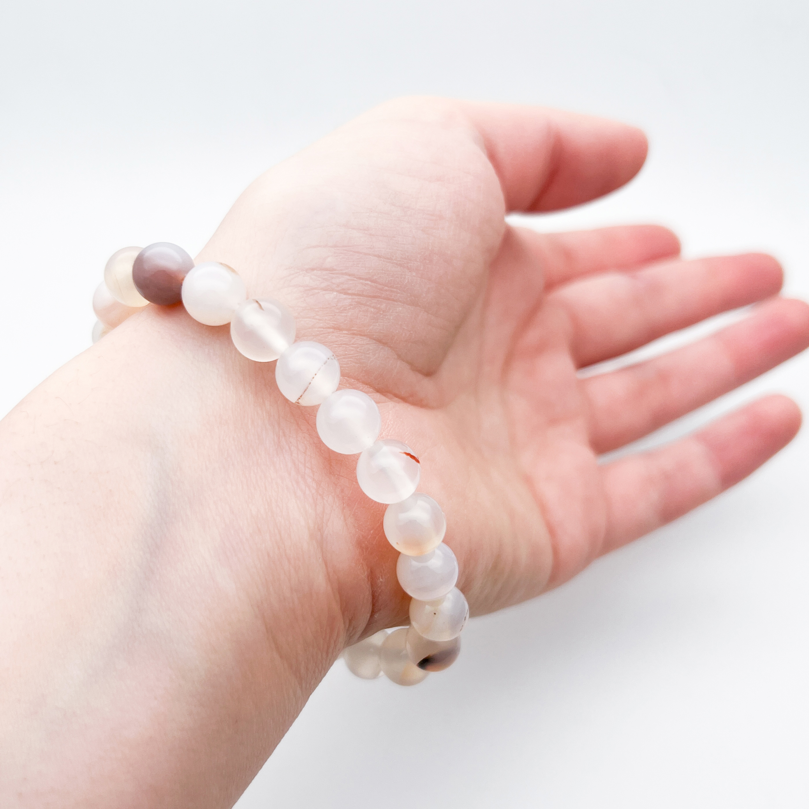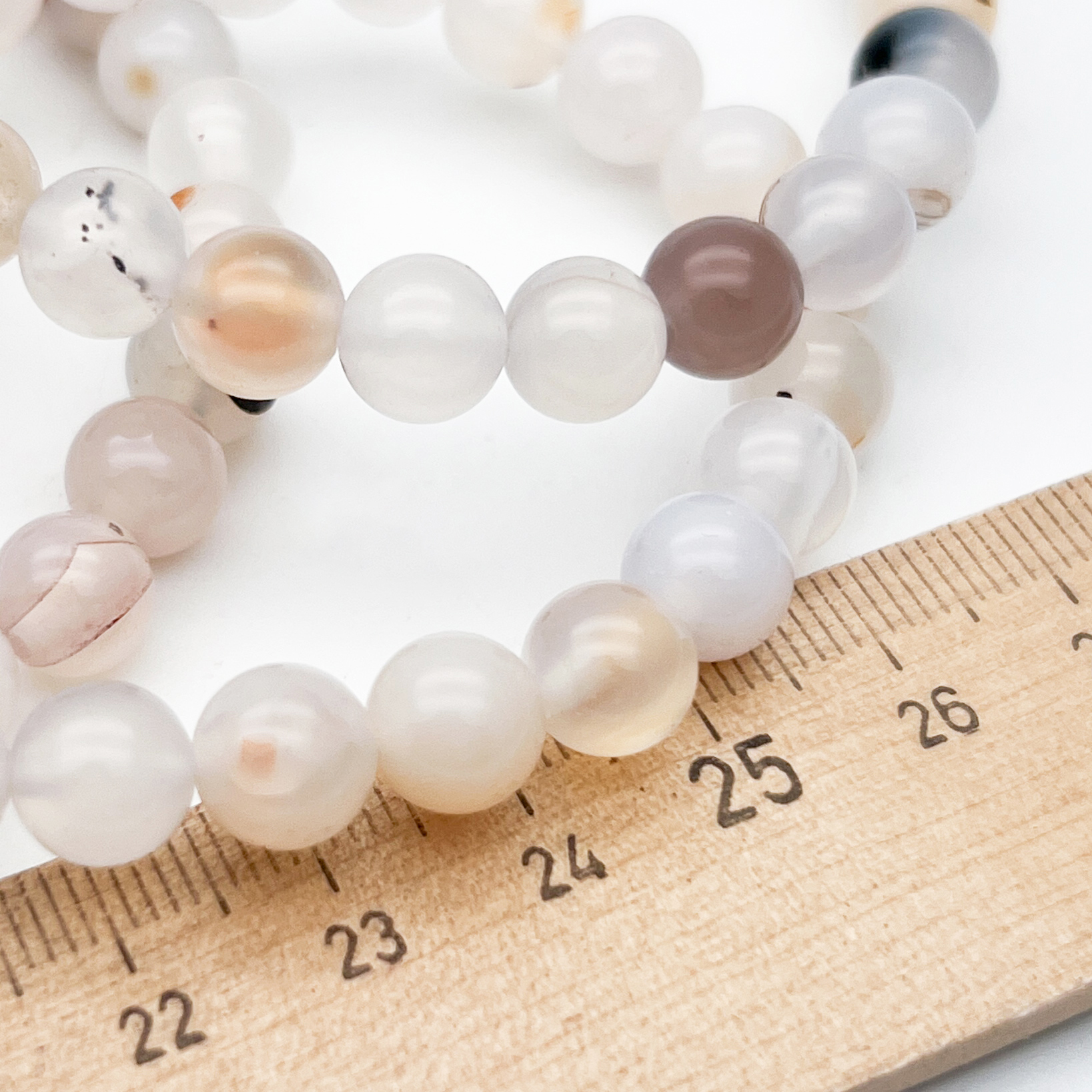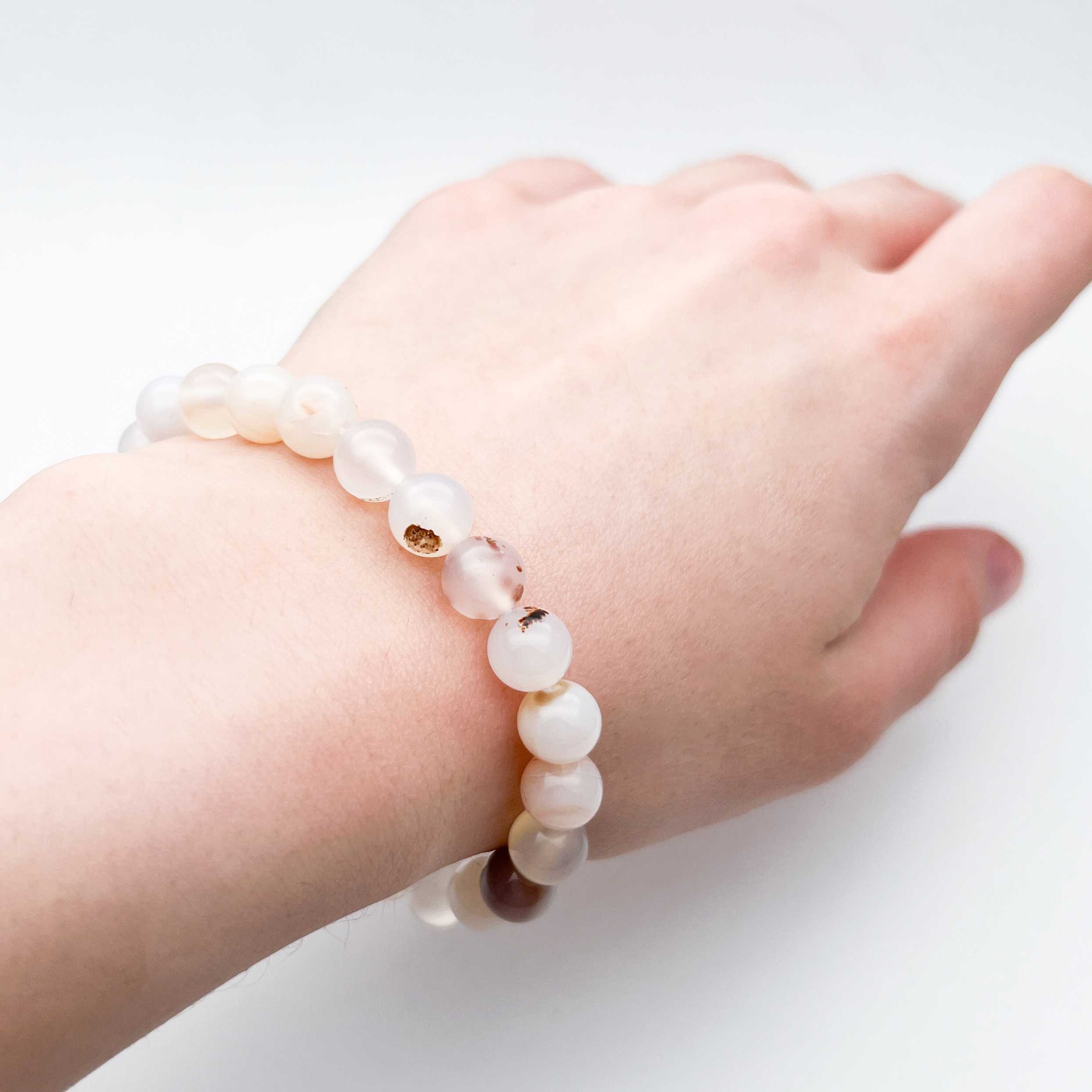 Браслет изготовлен из бусин натурального халцедона в молочно-бежевой цветовой гамме.