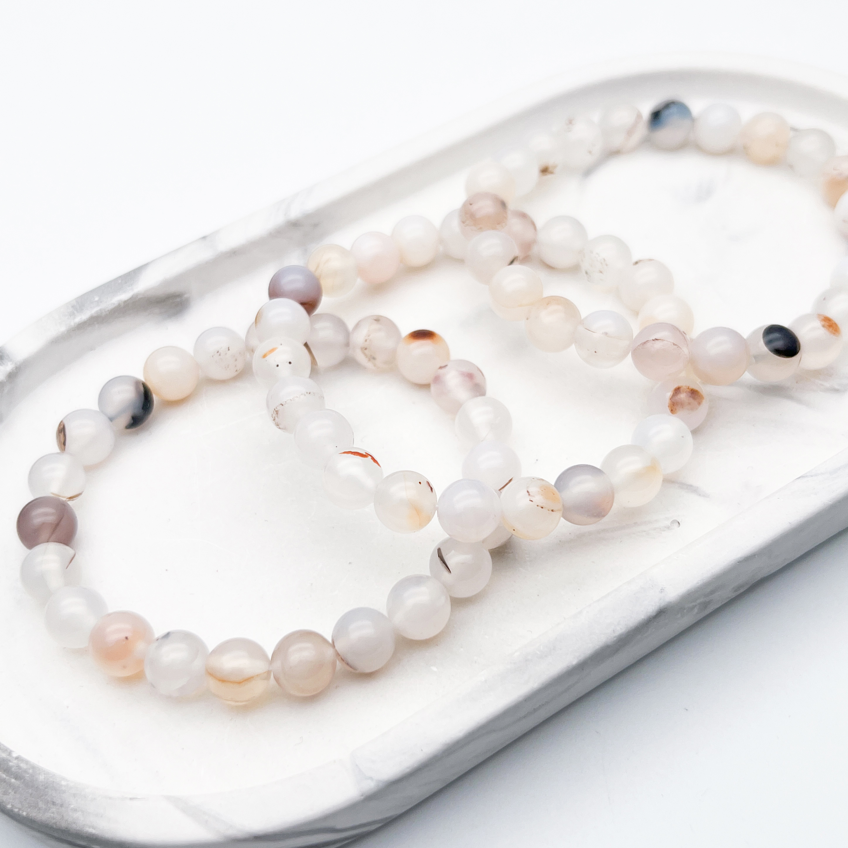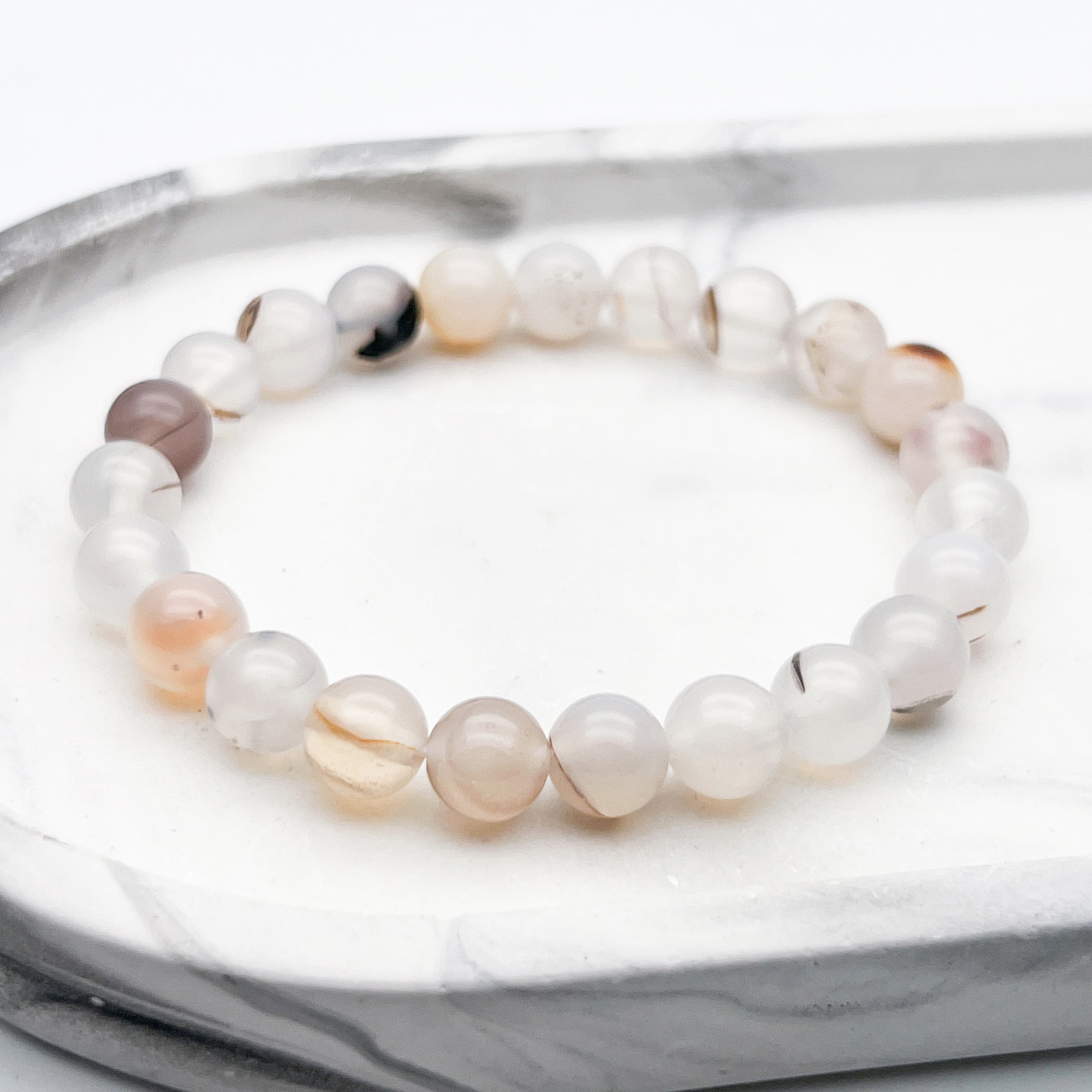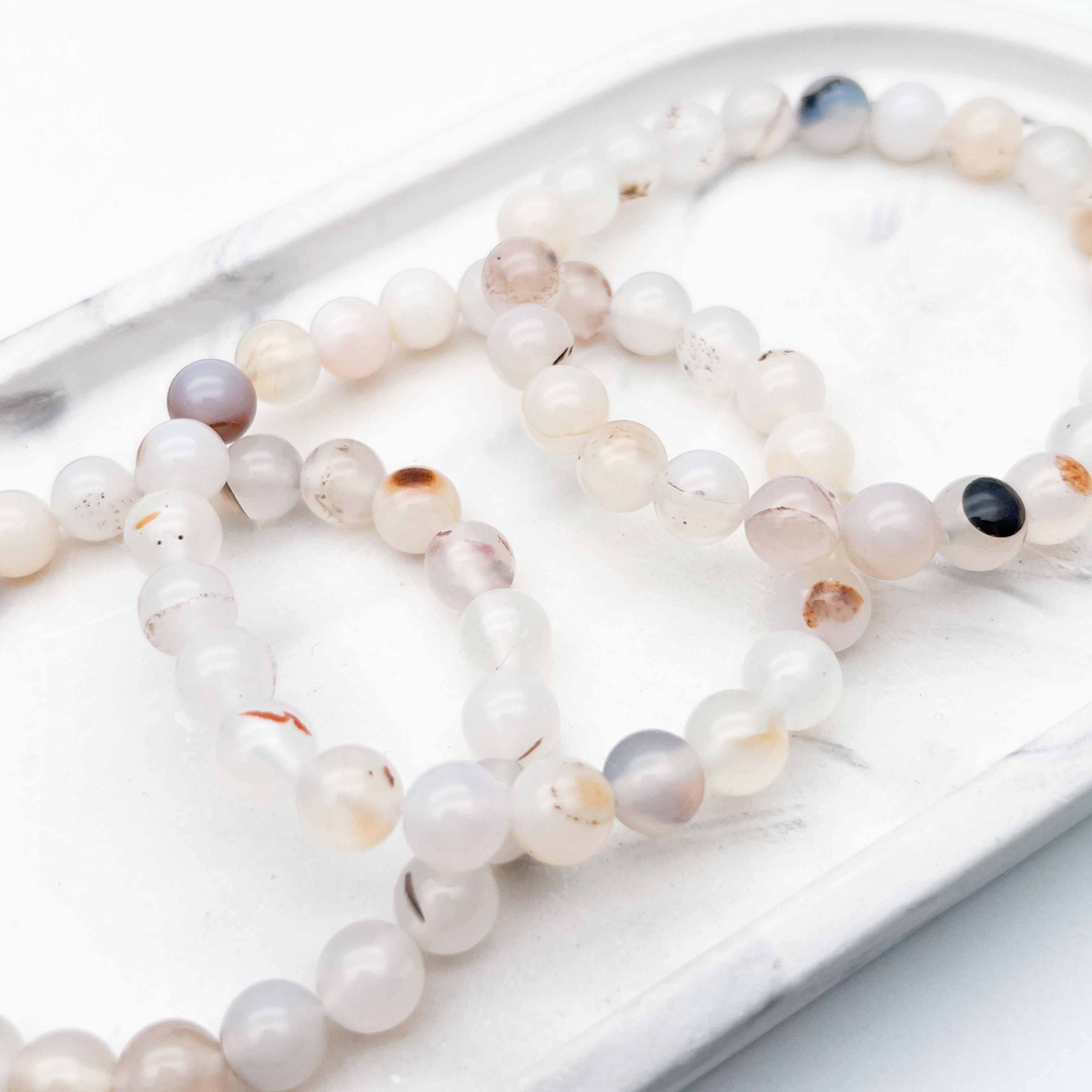 Браслет изготовлен из бусин натурального халцедона в молочно-бежевой цветовой гамме.