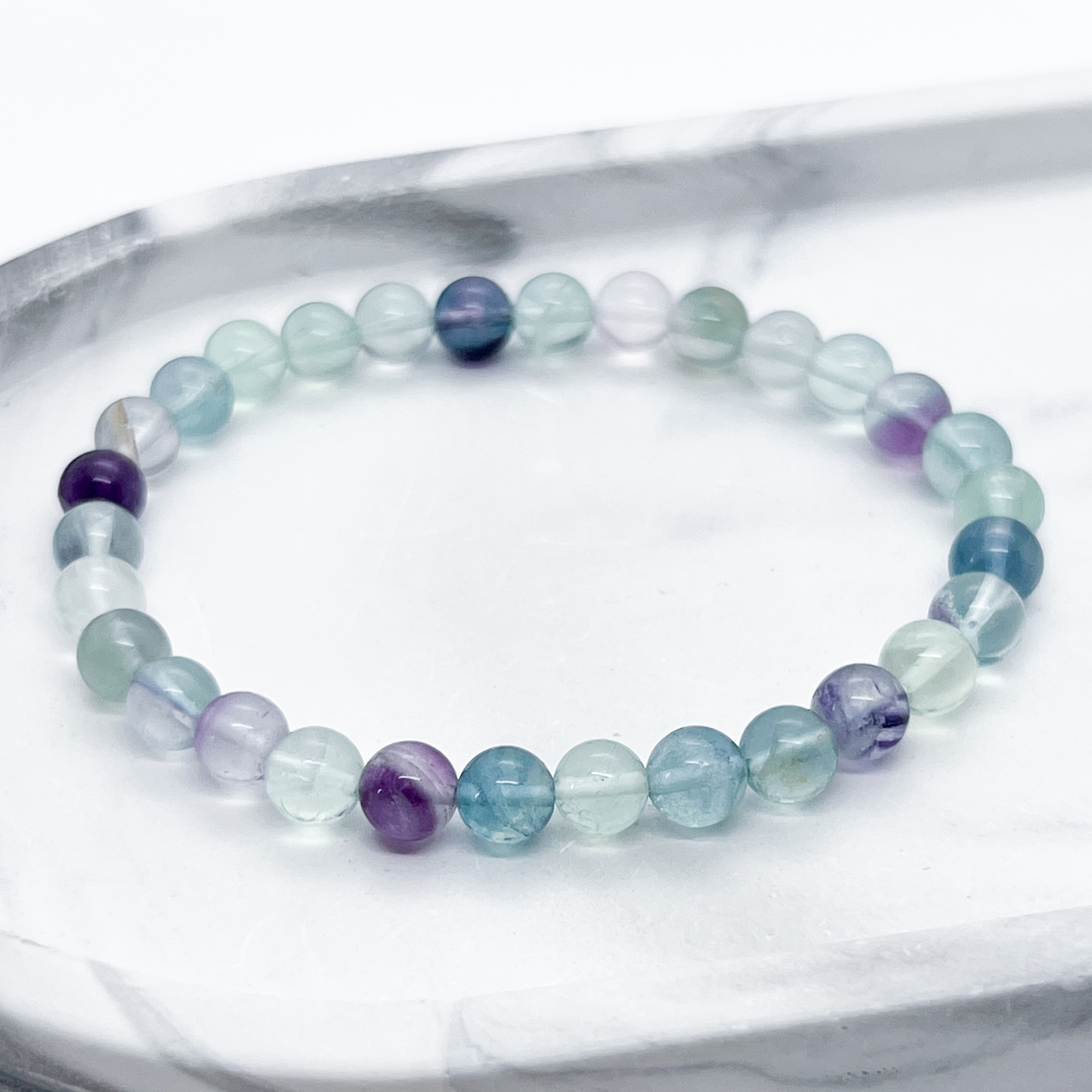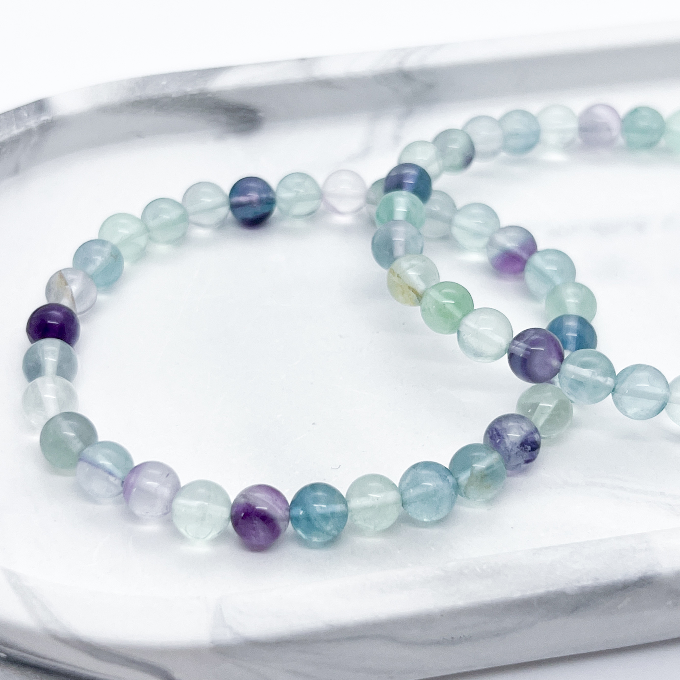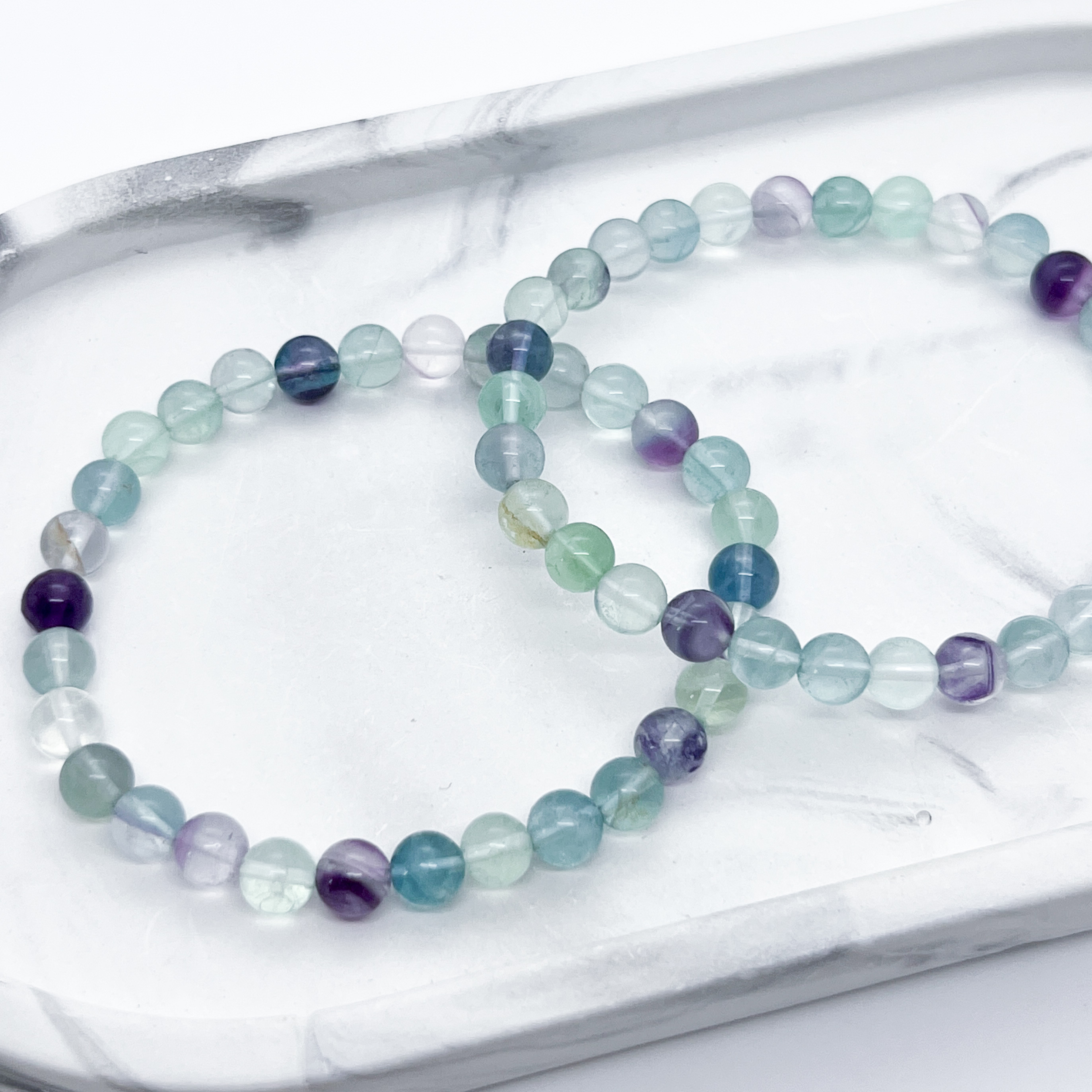 Браслет изготовлен из бусин натурального флюорита. Это камень с широкой палитрой возможных оттенков. В формате бусин встречается, как правило, фиолетово-зеленая цветовая гамма.