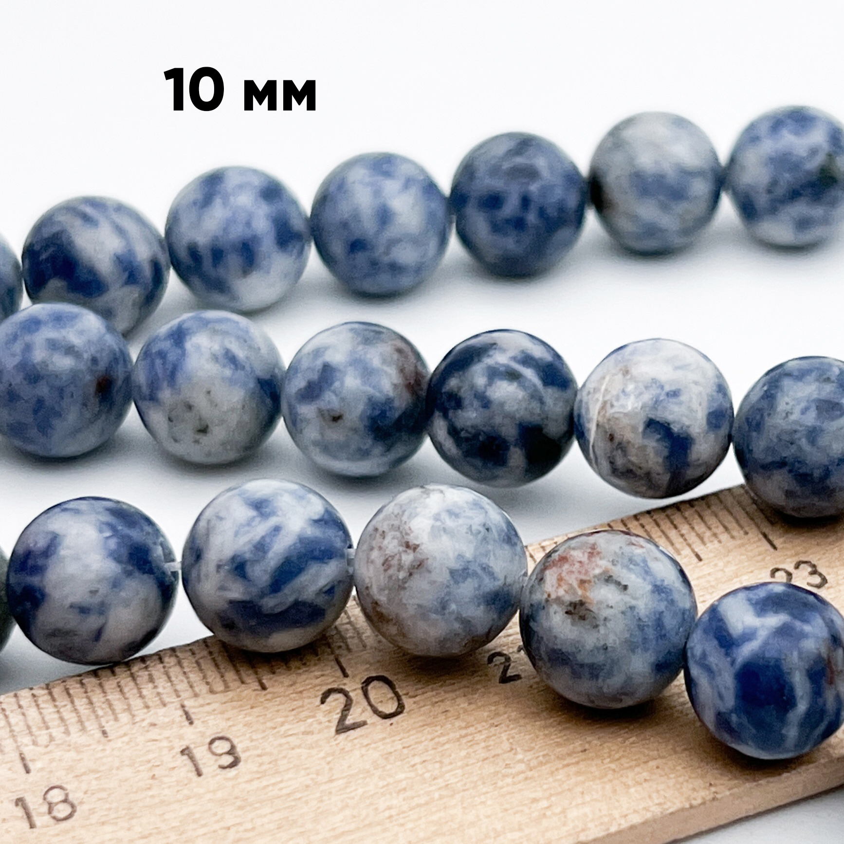 Бусины изготовлены из натурального камня содалит. Такую разновидность содалита также называют "blue spot" - "голубые точки".
