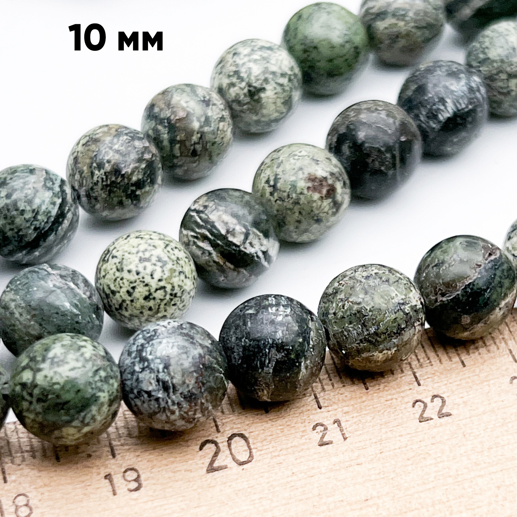 Бусины изготовлены из натурального камня - породы, в которой основным минералом выступает природный серпентин. Такой камень также называют змеевик.