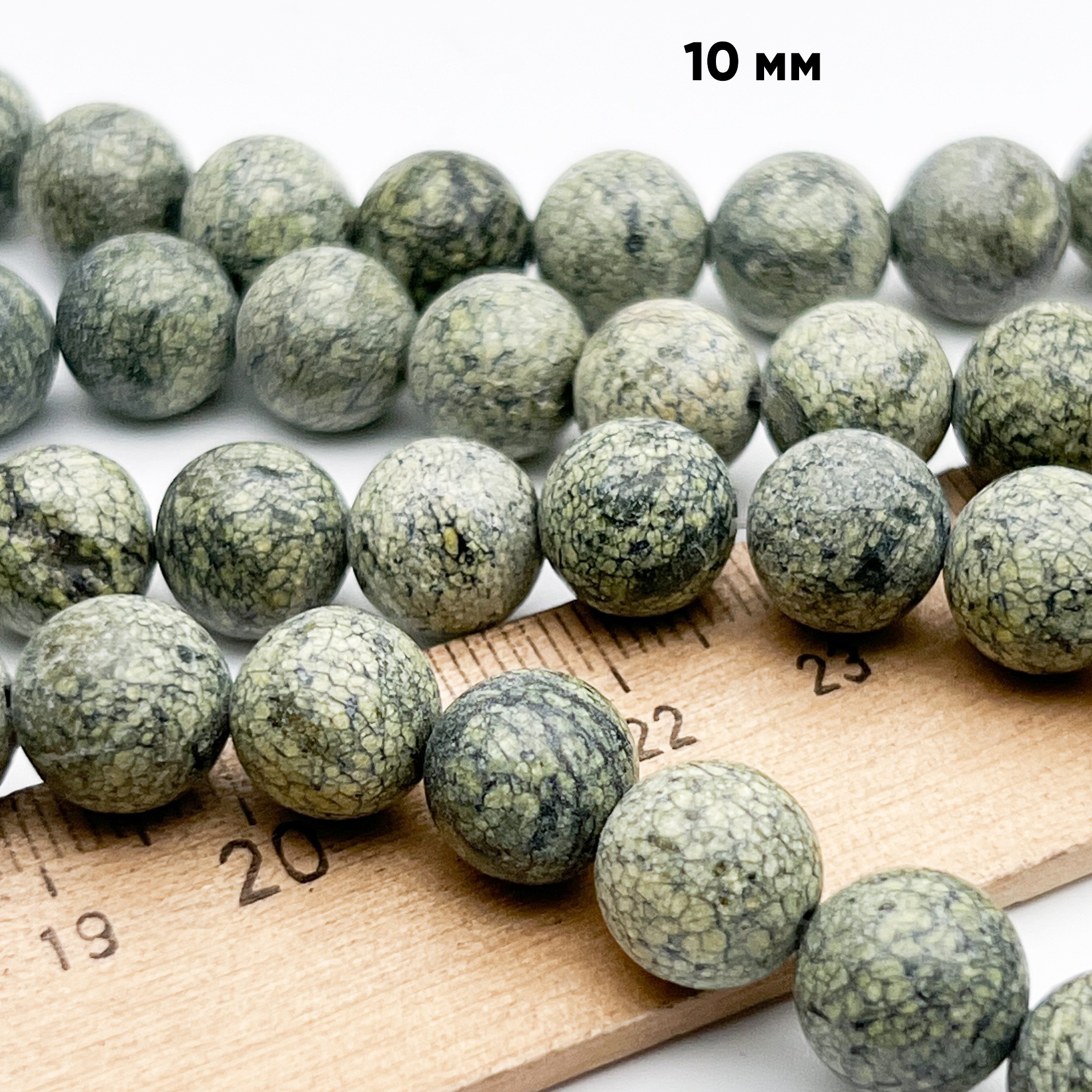 Бусины выполнены из натурального камня серпентинит. Это горная порода, основную массу которой составляет минерал серпентин. Второе название - змеевик.